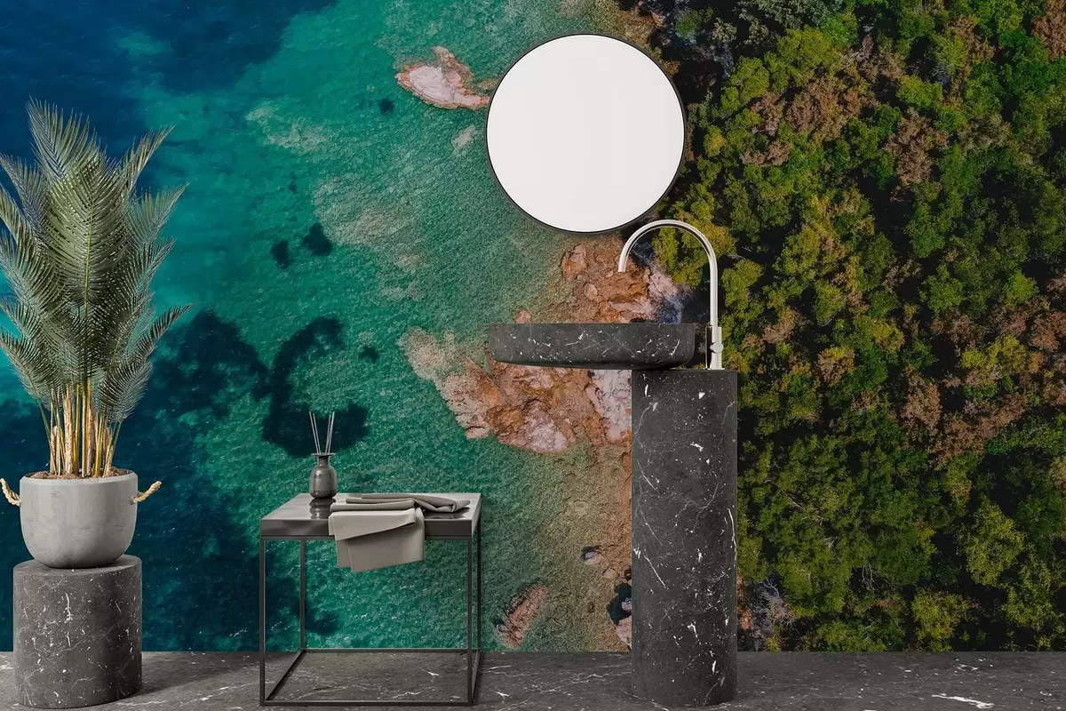 Carta da parati Spagna, costa marina con acqua marina, pineta, fotografia aerea nr. w04099