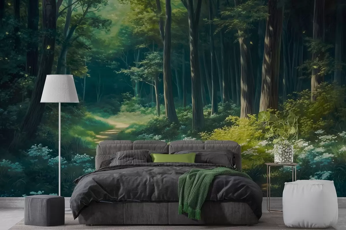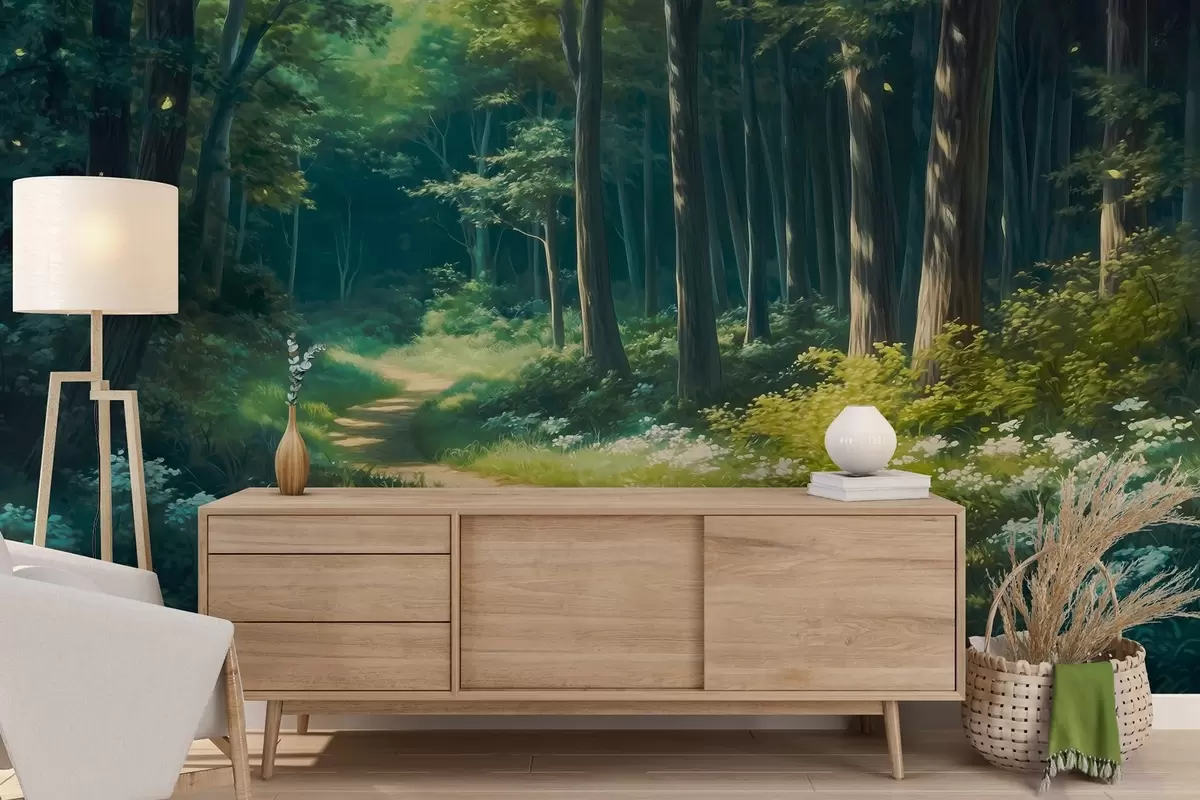 carta da parati Foresta verde con luce del sole, alberi e fiori bianchi, disegno ad olio nr. w04118