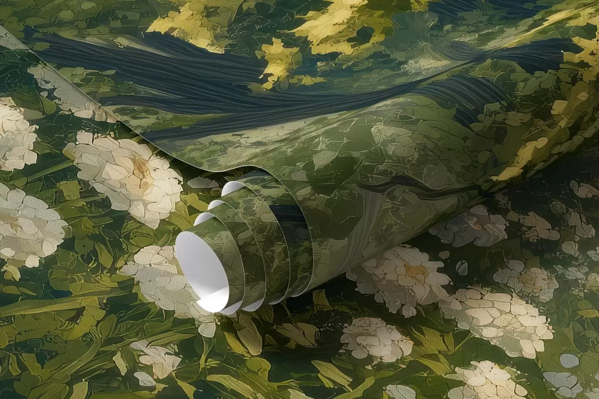 Carta da parati Sentiero nella foresta verde, fiori bianchi, luce del sole, disegno in stile acrilico nr. w04119