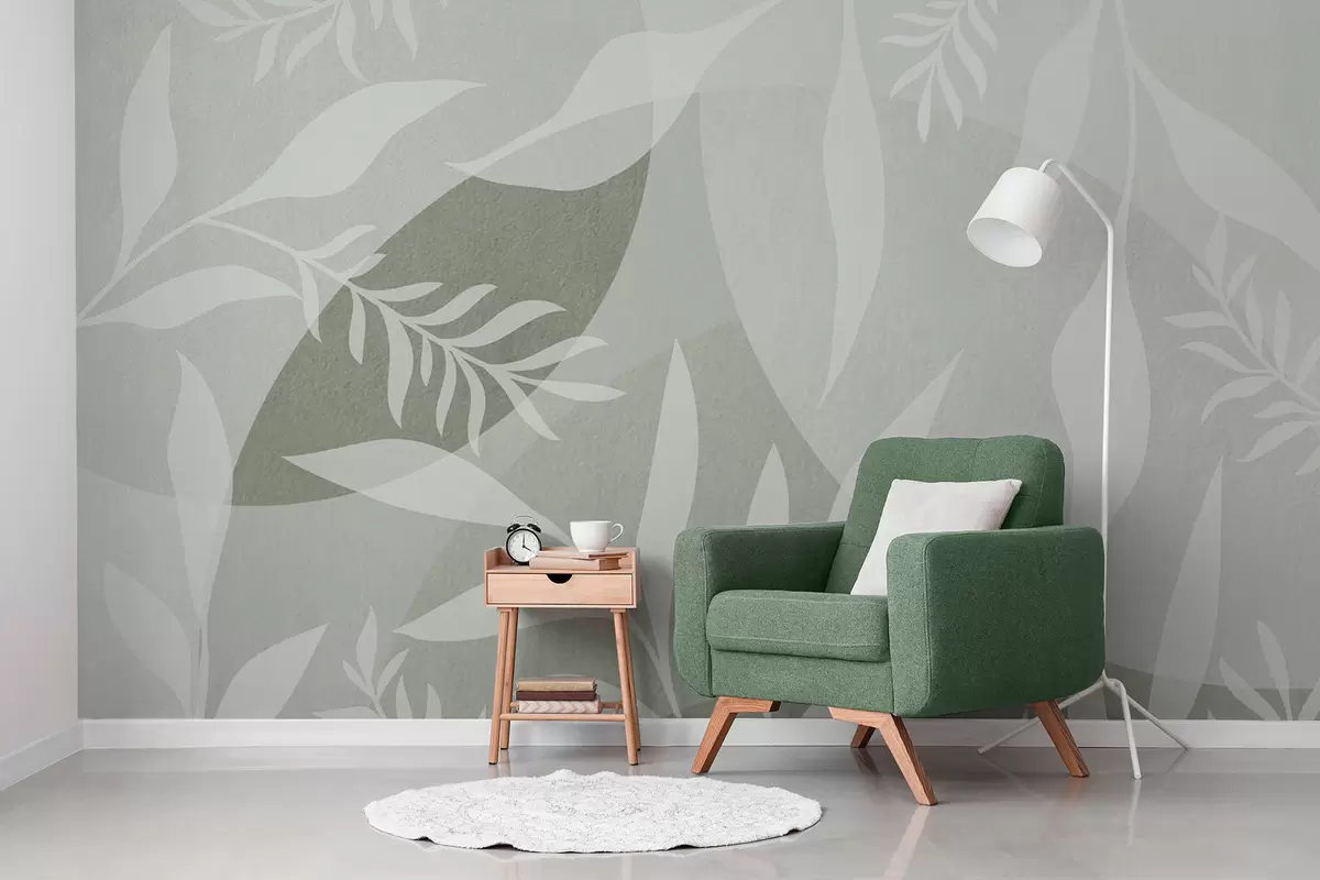 Carta da parati Sagome di ramoscelli su uno sfondo di cerchi astratti, tonalità di verde nr. w04270v2