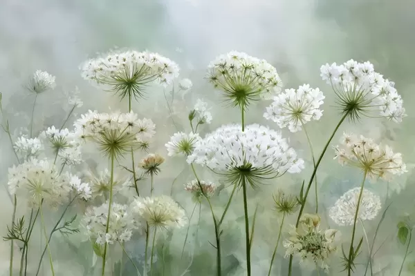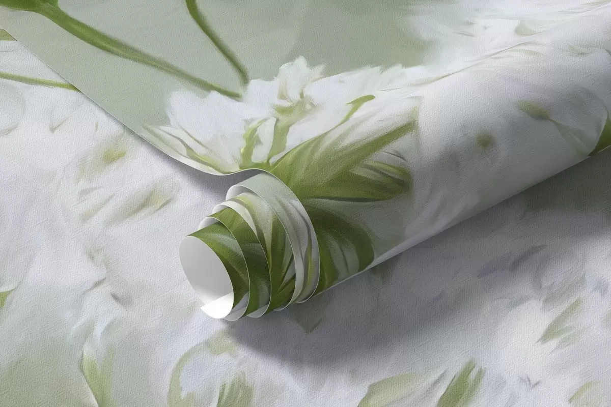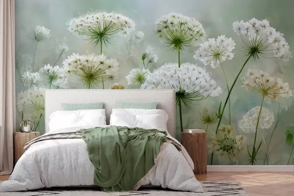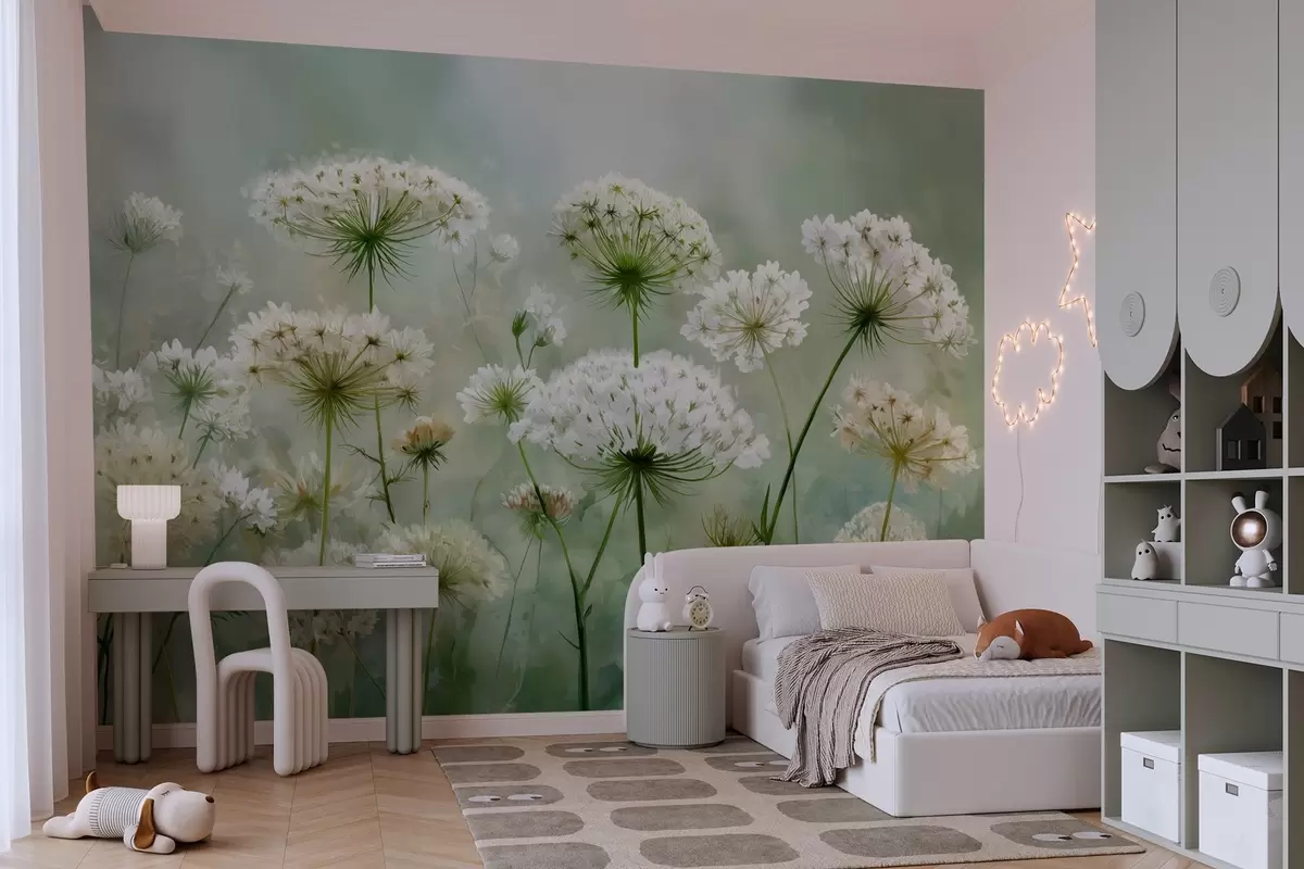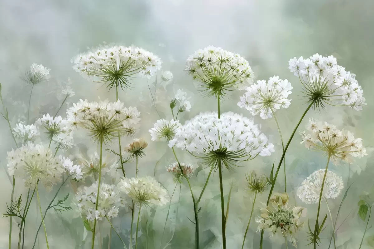 Carta da parati delicati fiori di campo bianchi Queen Anne, in stile pittoresco, tonalità di verde nr. w04313