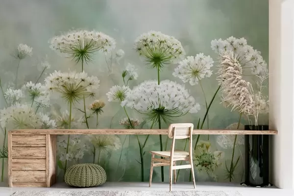 Carta da parati delicati fiori di campo bianchi Queen Anne, in stile pittoresco, tonalità di verde nr. w04313
