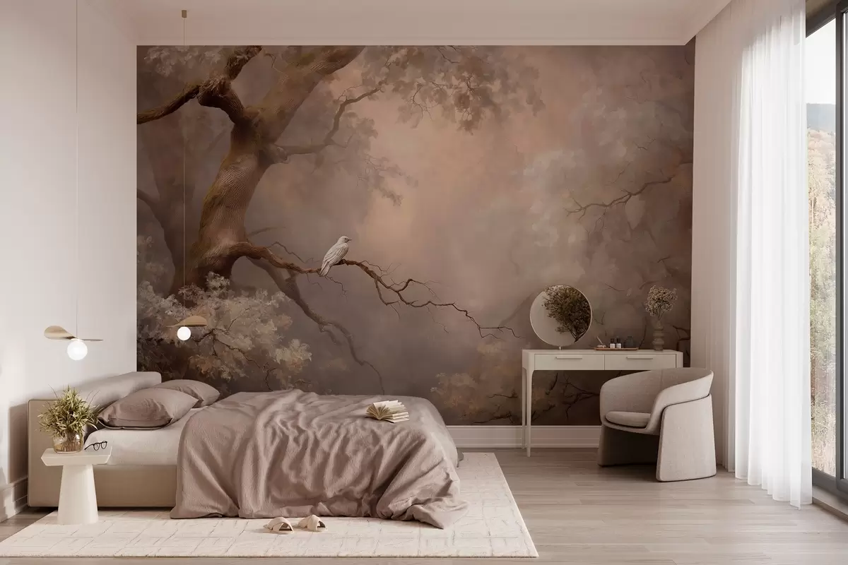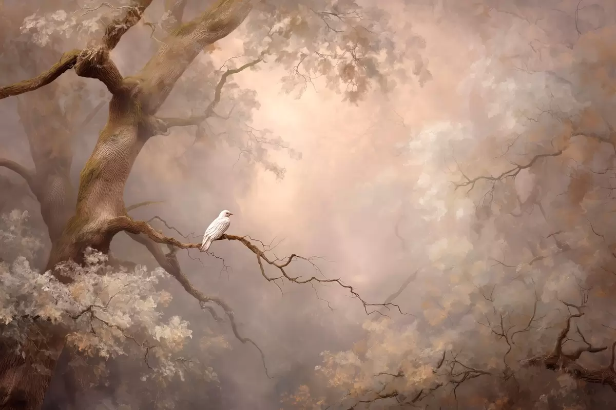 Carta da parati foresta mistica con un uccello bianco nr. w04314
