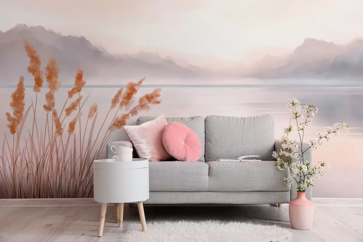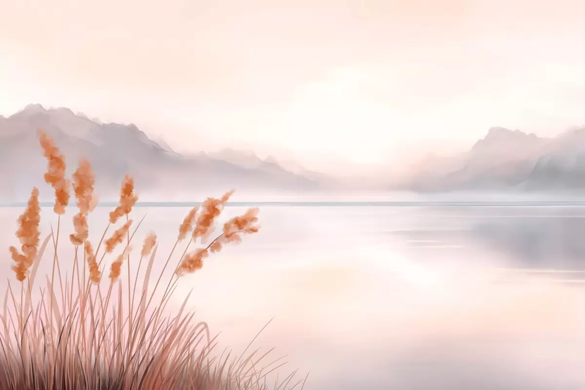 Carta da parati un lago pittoresco con canneti e montagne nr. w04315