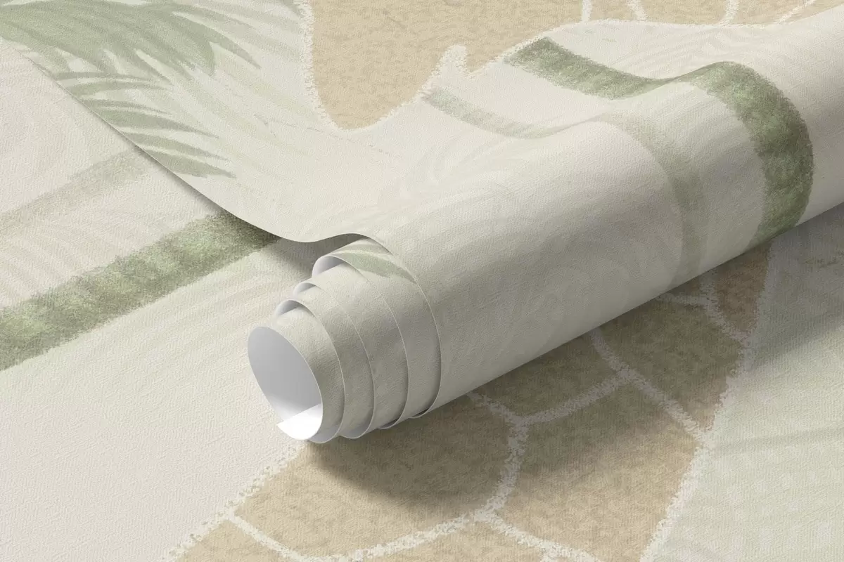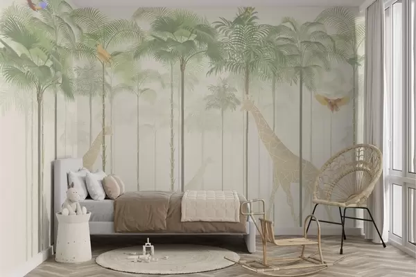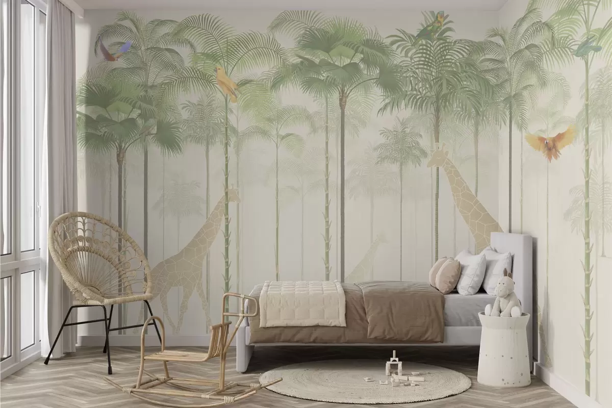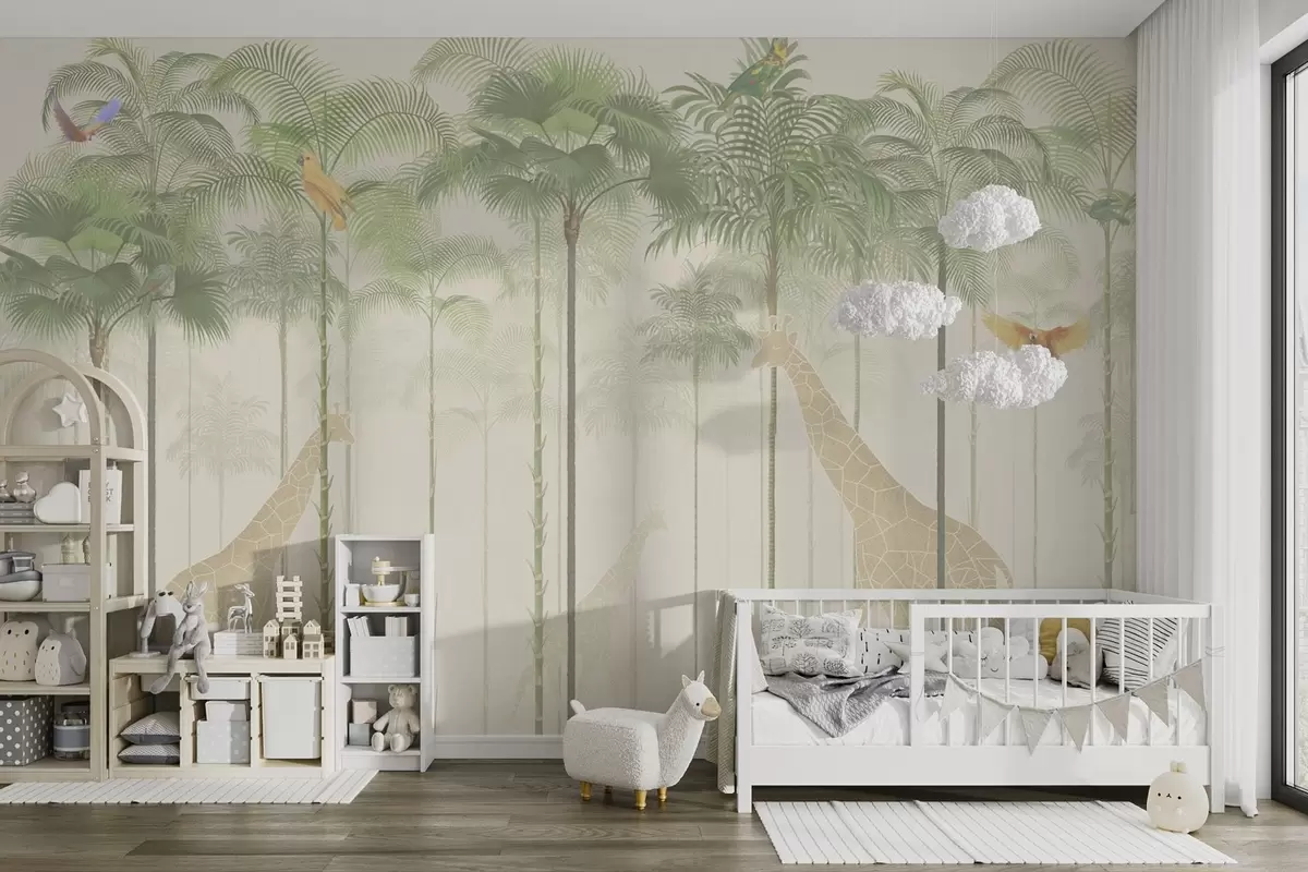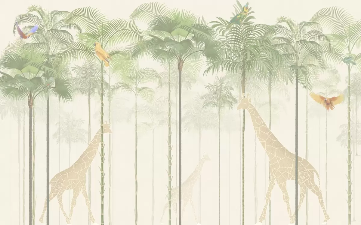Carta da parati Giraffe e uccelli tropicali tra alte palme nr. w04400