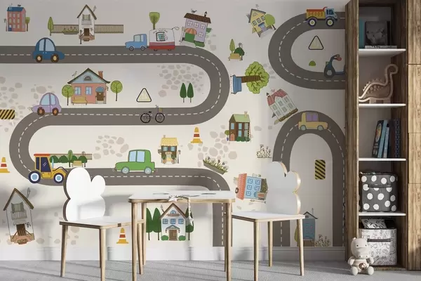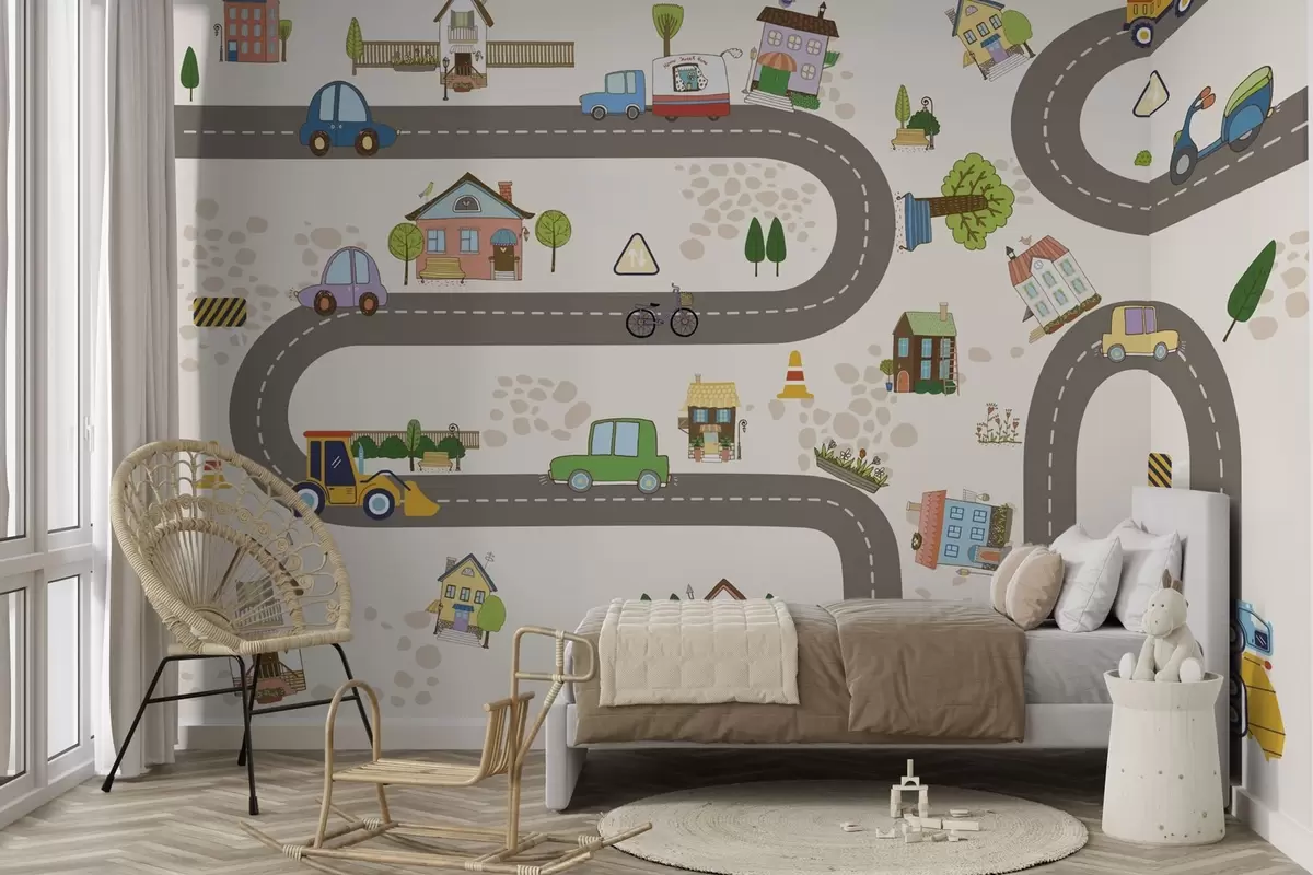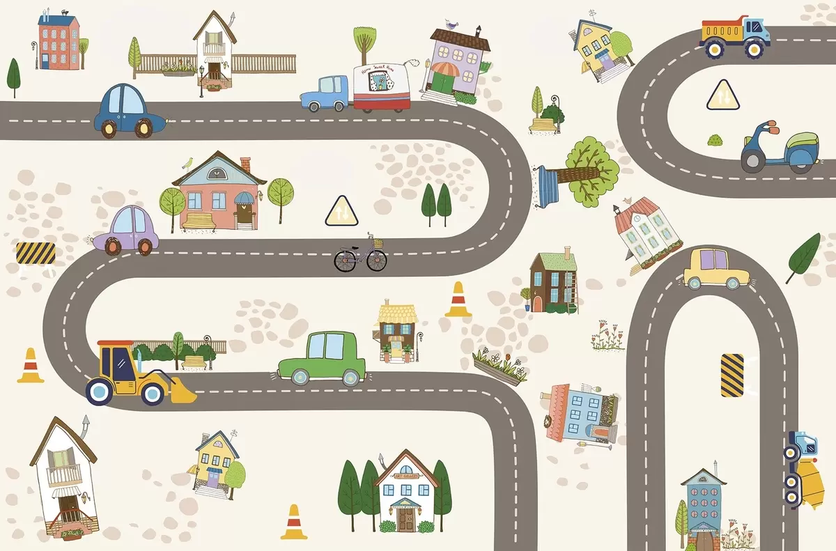Carta da parati Strada per bambini con auto e case colorate nr. w04404