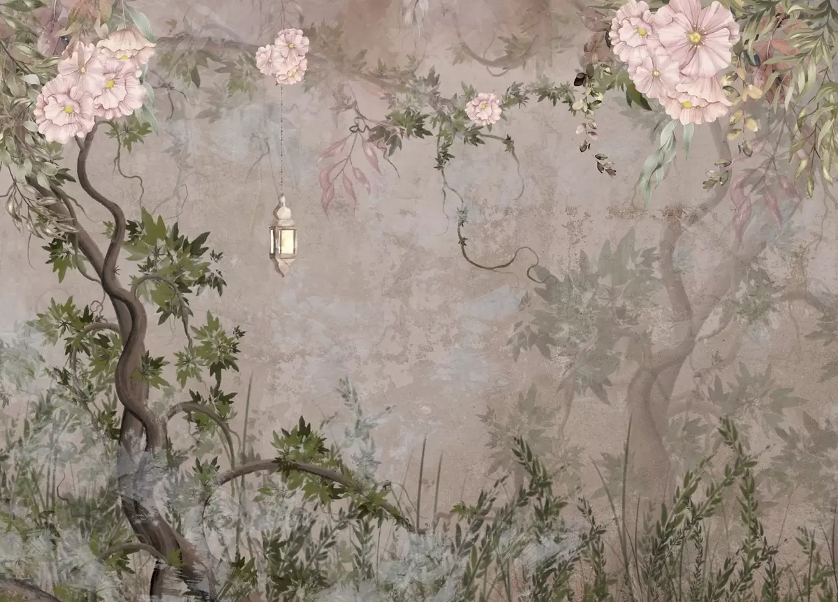 Carta da parati Giardino delle fate con fiori, alberi e lanterna nr. w04416
