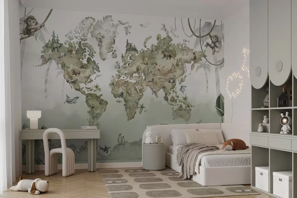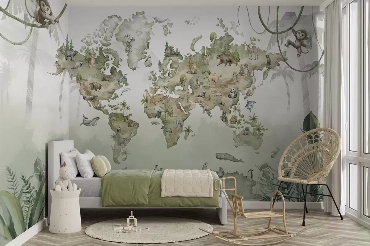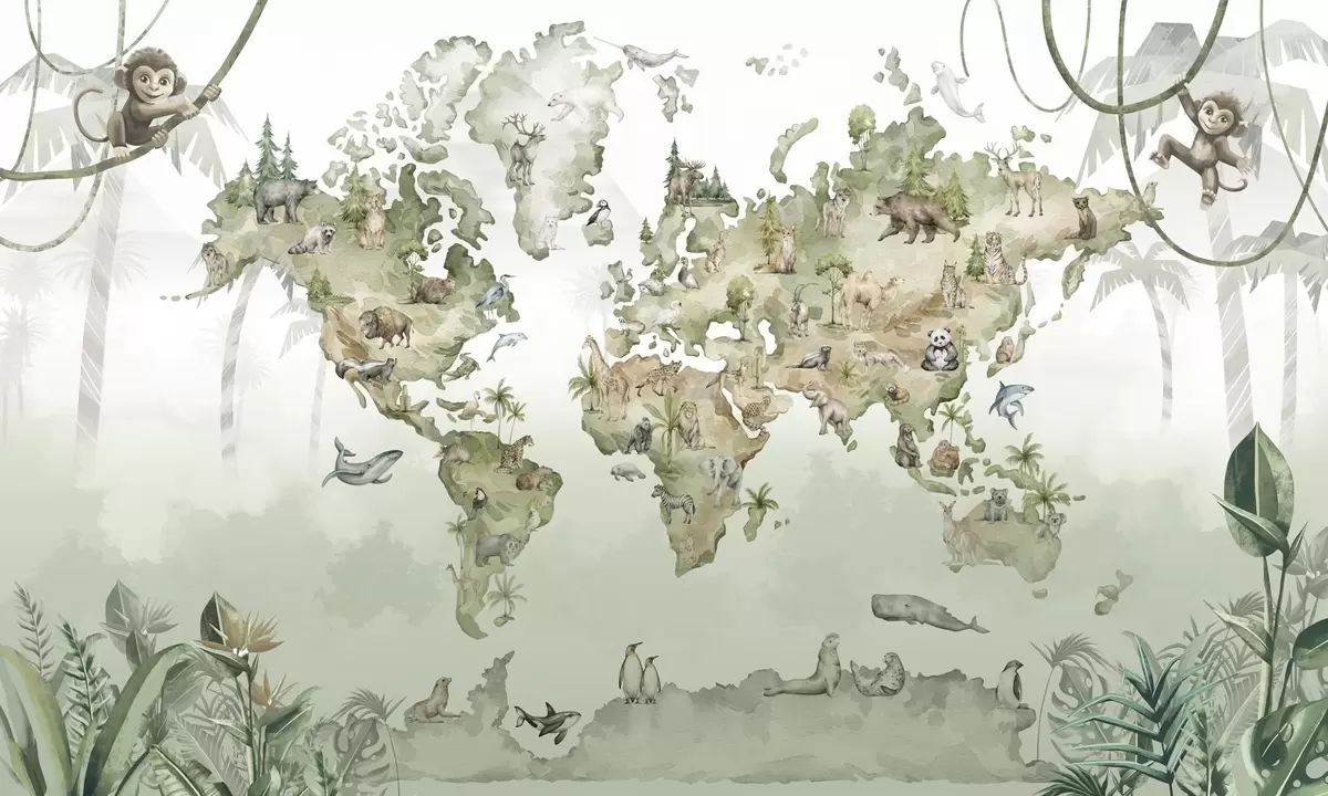Carta da parati Mappa del mondo illustrata con animali e giungle nr. w04418v1