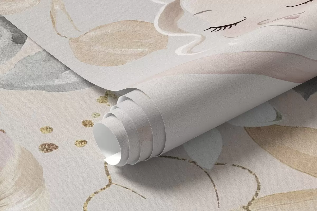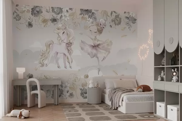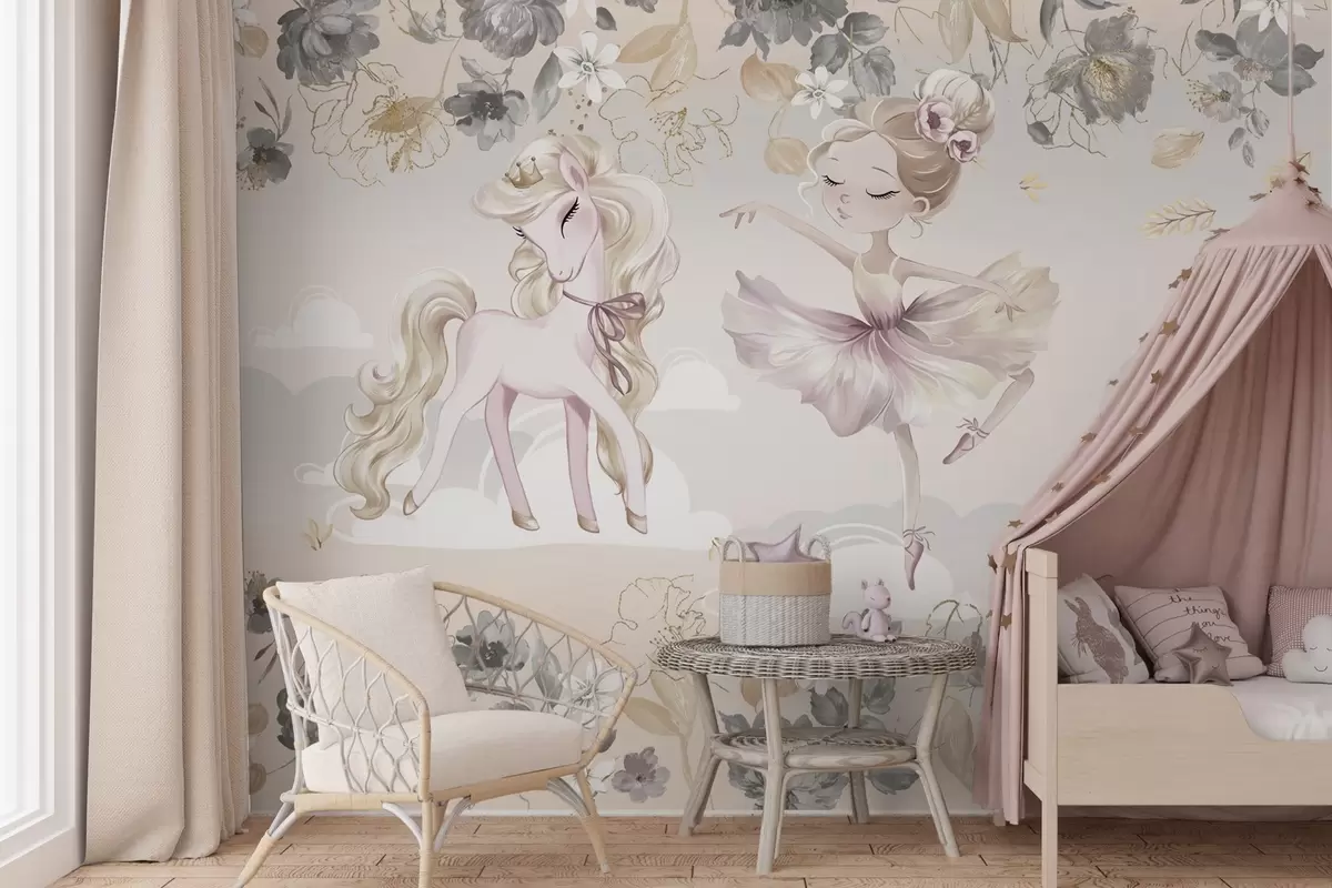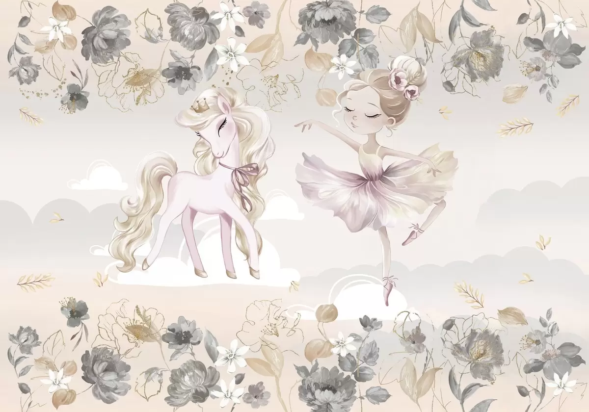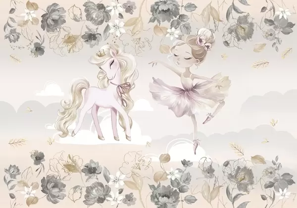 Carta da parati Un pony bianco come la neve e una ballerina tra fiori e nuvole nr. w04419