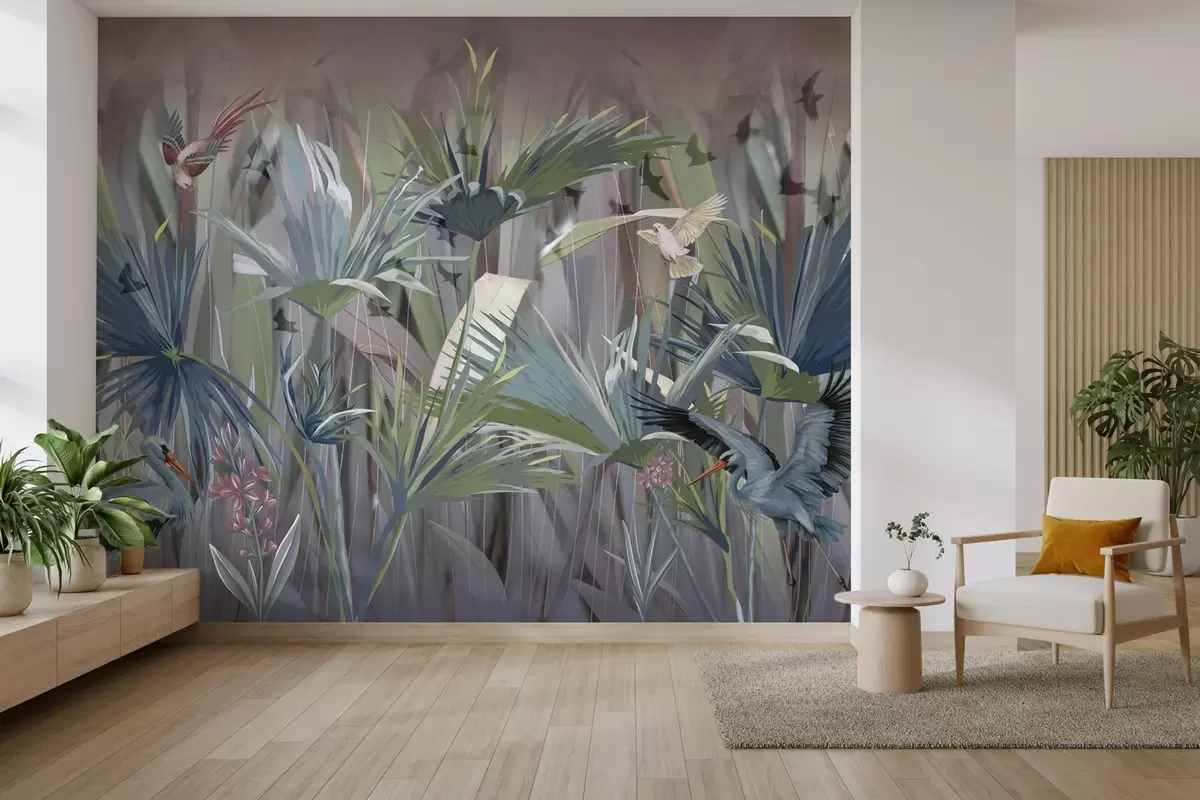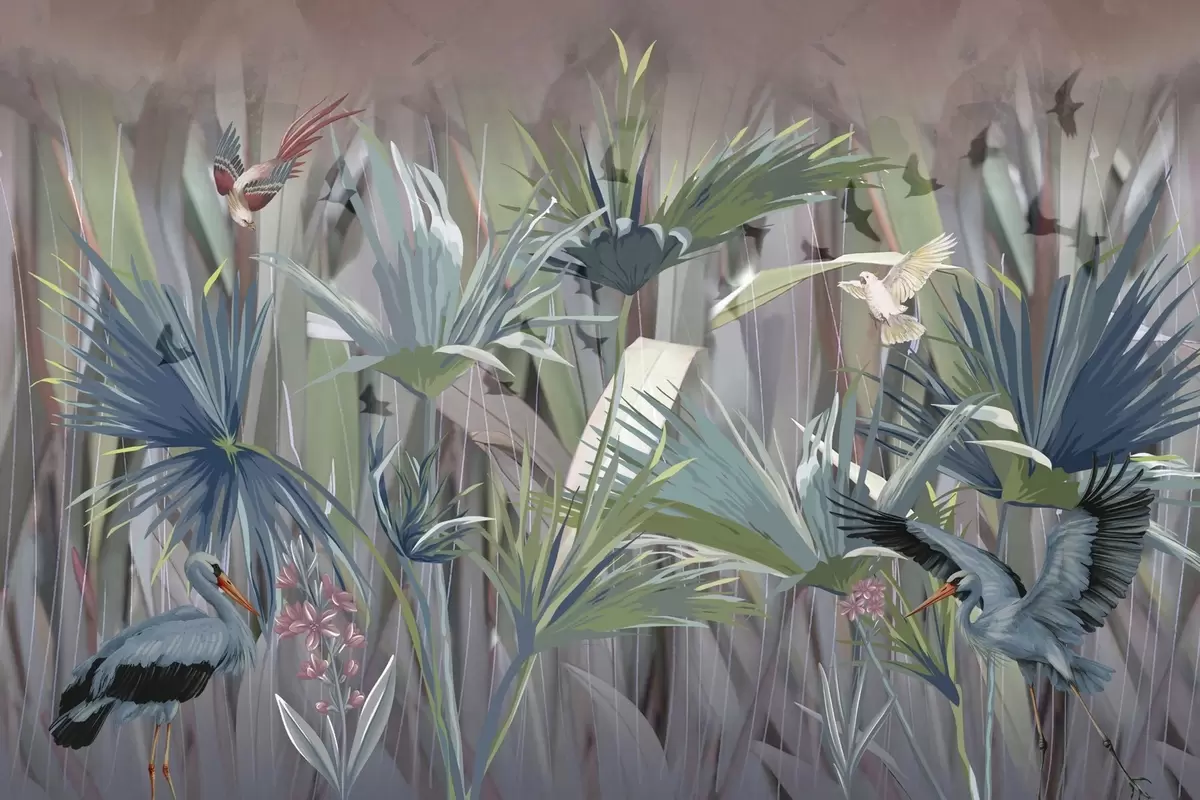 Carta da parati Uccelli esotici tra foglie di palma e fiori nr. w04458