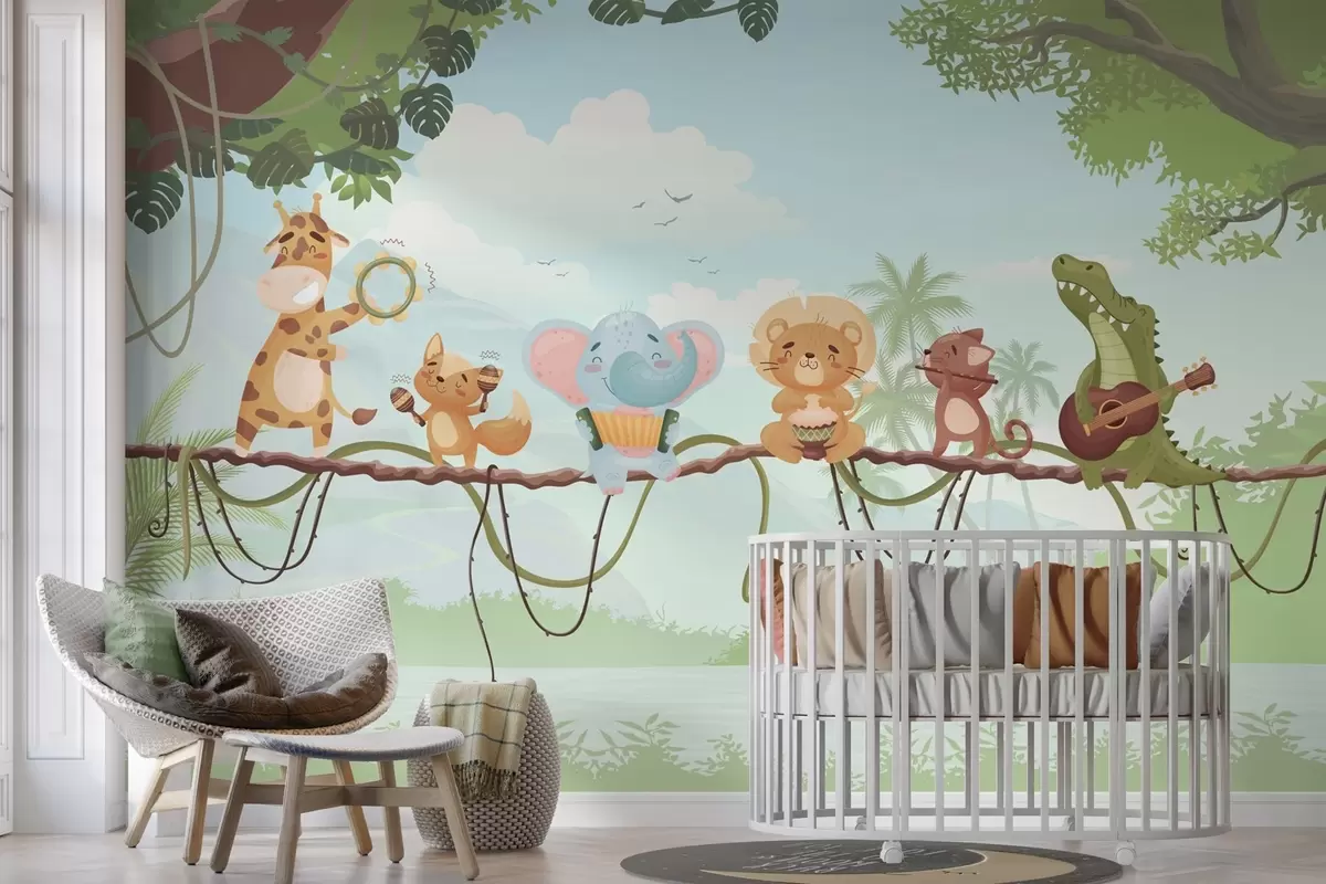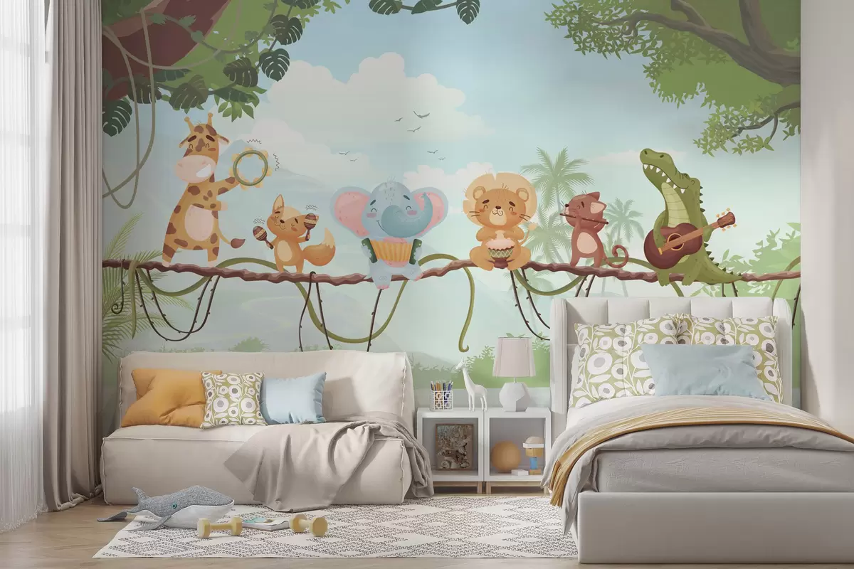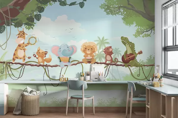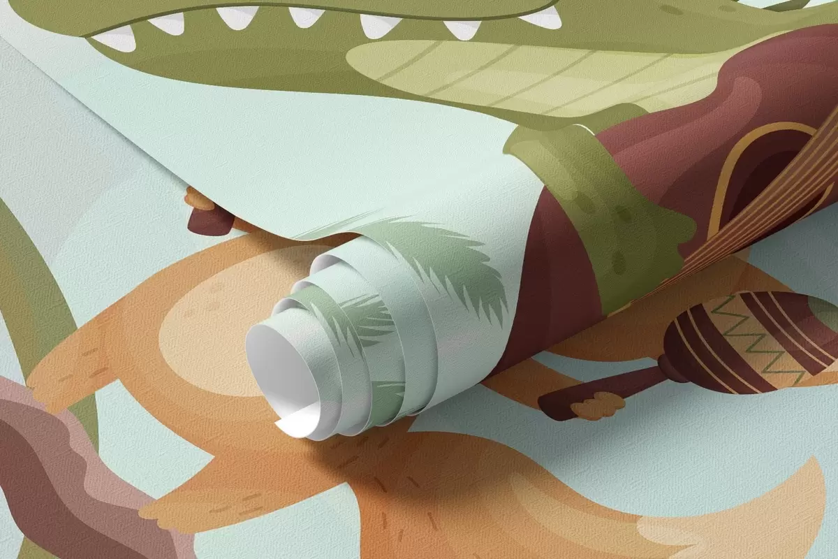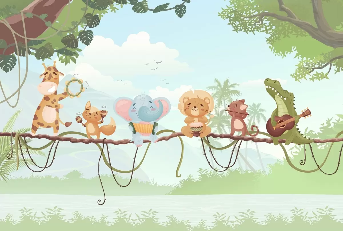 Carta da parati Animali con strumenti musicali su uno sfondo tropicale nr. w04505