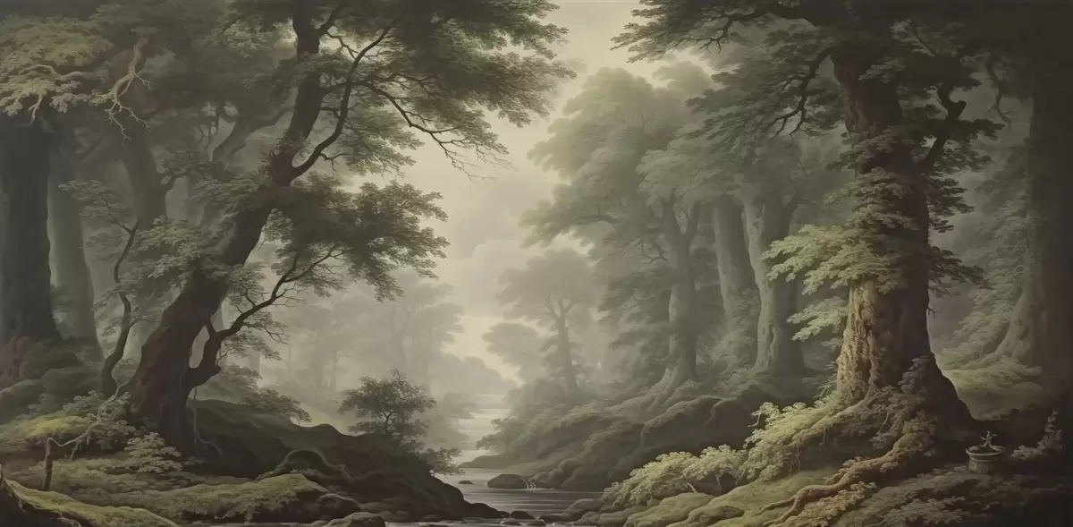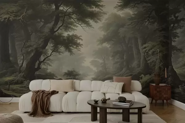Carta da parati Foresta nebbiosa con fiume e alberi secolari ad alto fusto nr. w04555