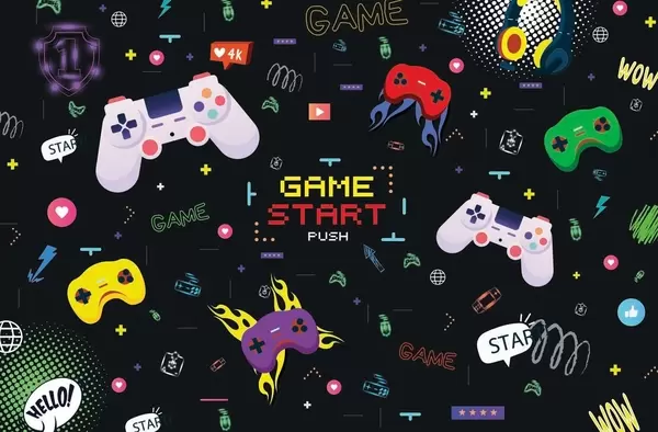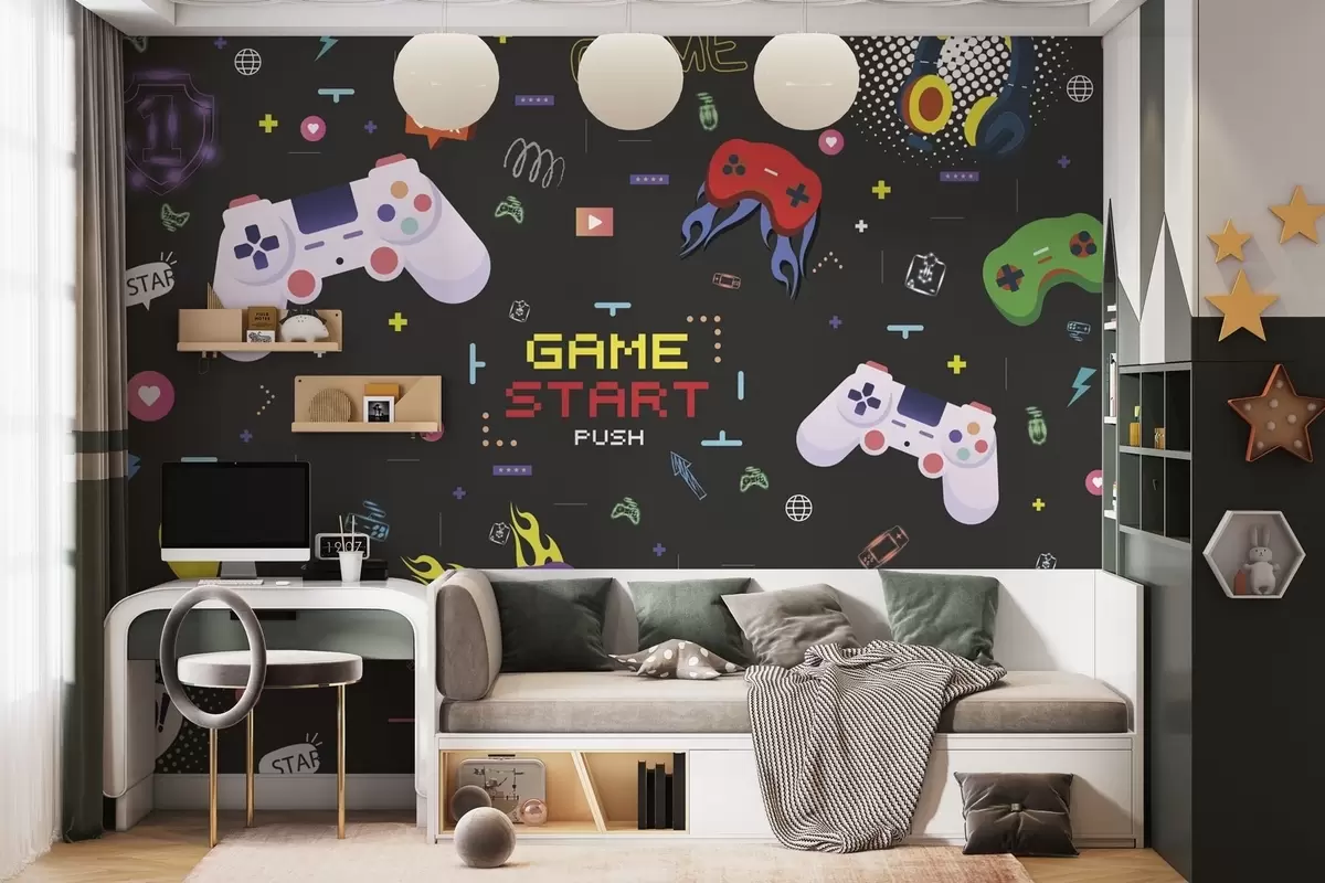 Carta da parati Motivo vivace dedicato ai videogiochi con console e testo pixelato nr. w04581