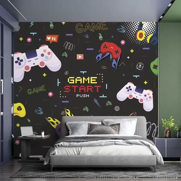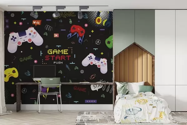 Carta da parati Motivo vivace dedicato ai videogiochi con console e testo pixelato nr. w04581