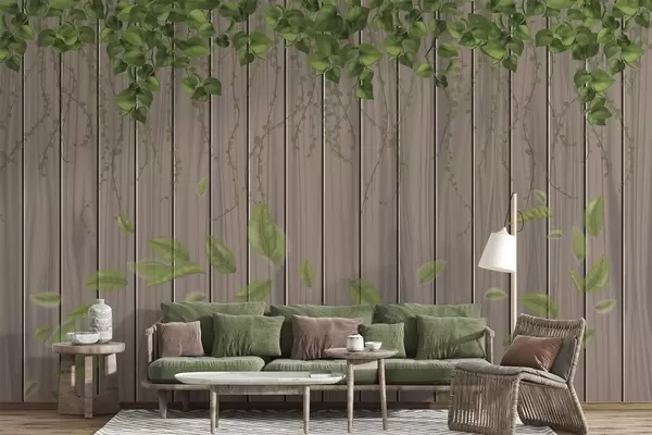 Carta da parati Tavole di legno imitazione con foglie pendenti nr. w04603