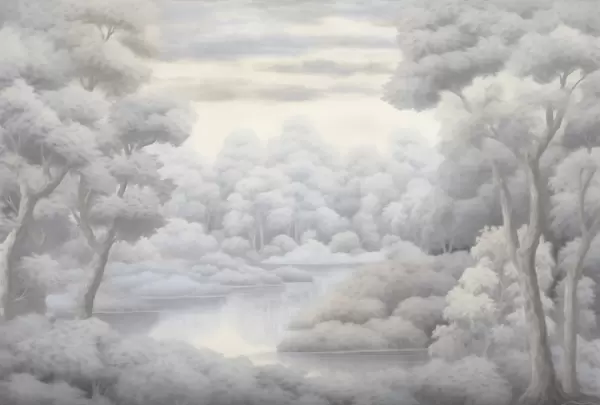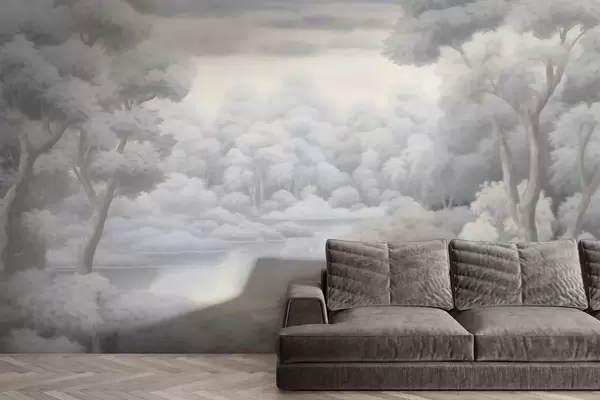 Carta da parati Foresta nebbiosa e lago in morbide tonalità di grigio nr. w04617