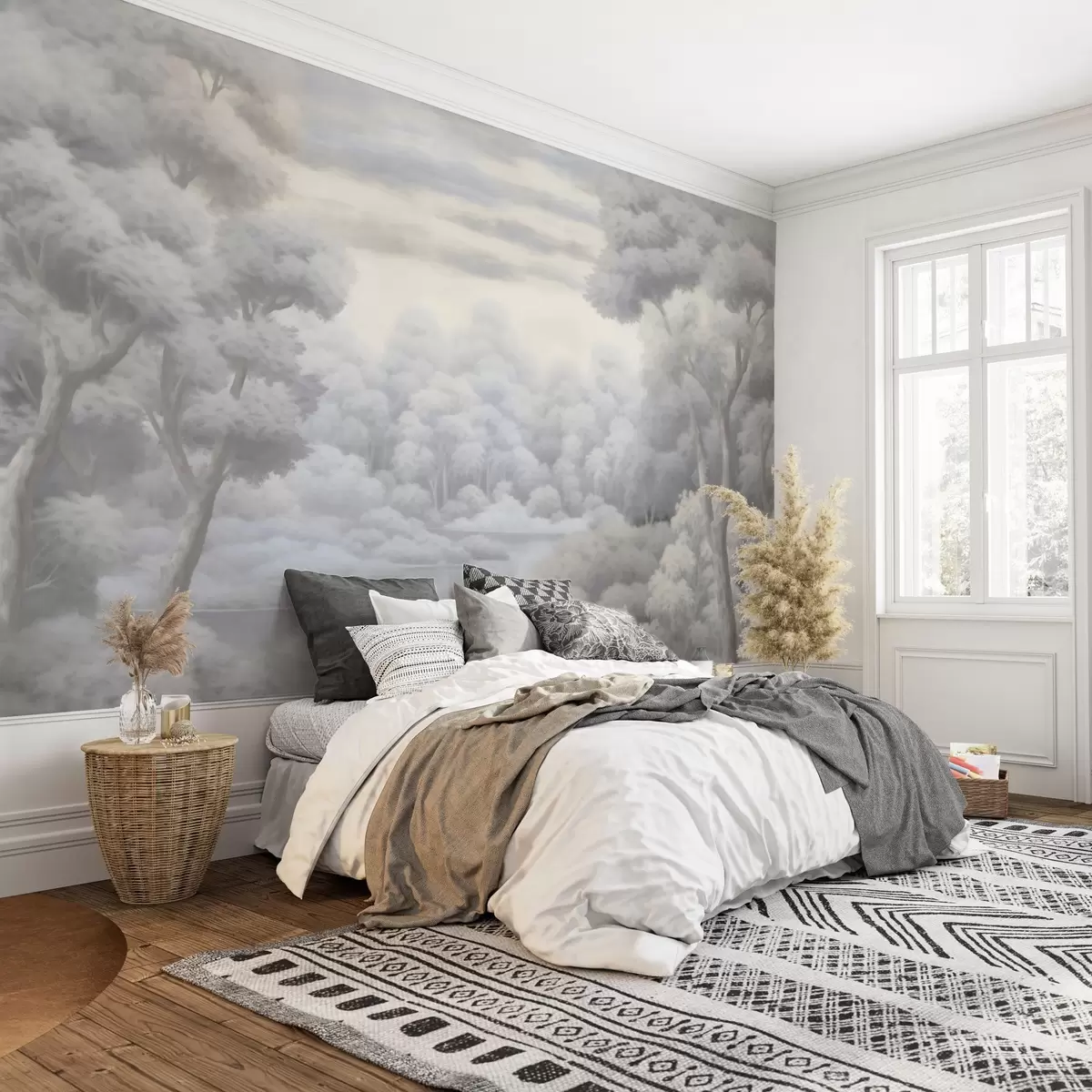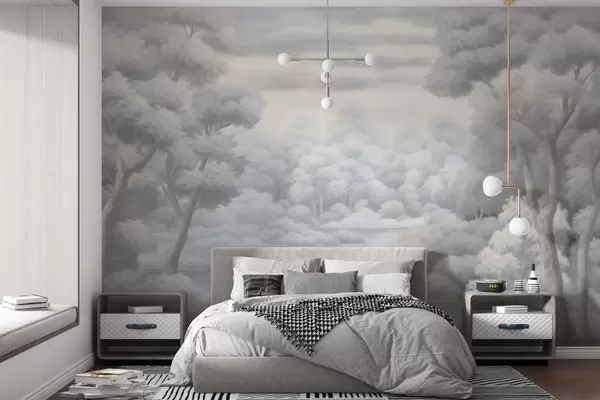 Carta da parati Foresta nebbiosa e lago in morbide tonalità di grigio nr. w04617