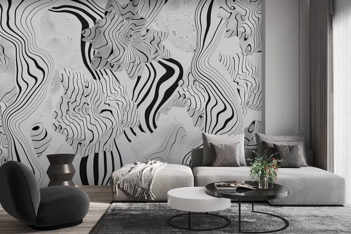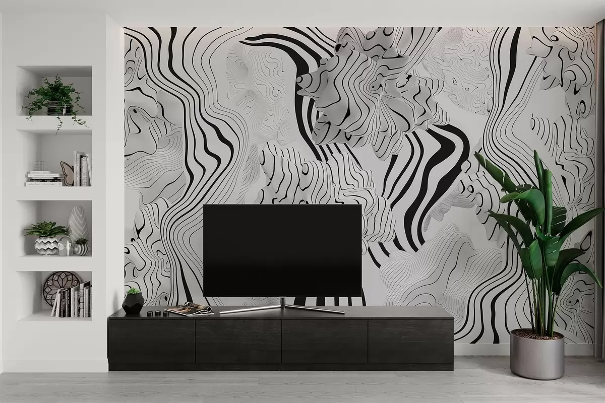 Carta da parati forme organiche astratte in stile 3D nei toni del bianco e del grigio con strisce nere nr. w04627