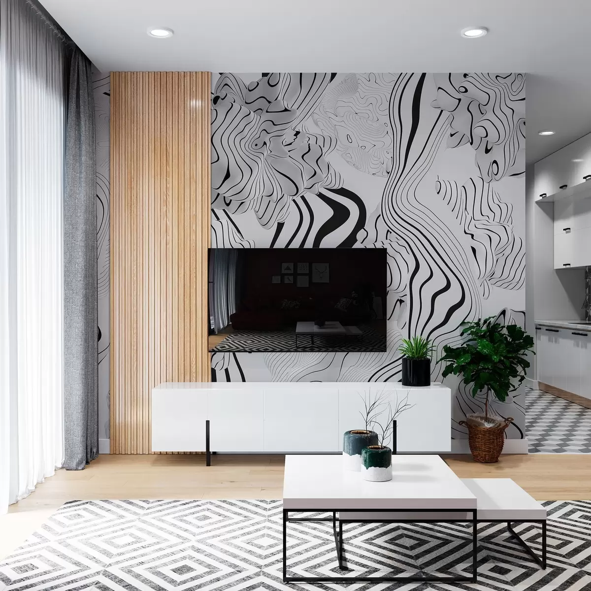 Carta da parati forme organiche astratte in stile 3D nei toni del bianco e del grigio con strisce nere nr. w04627