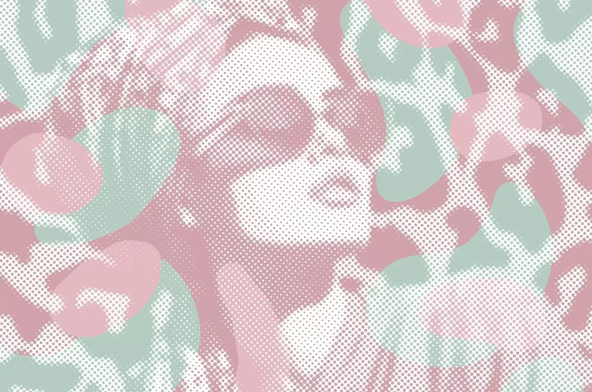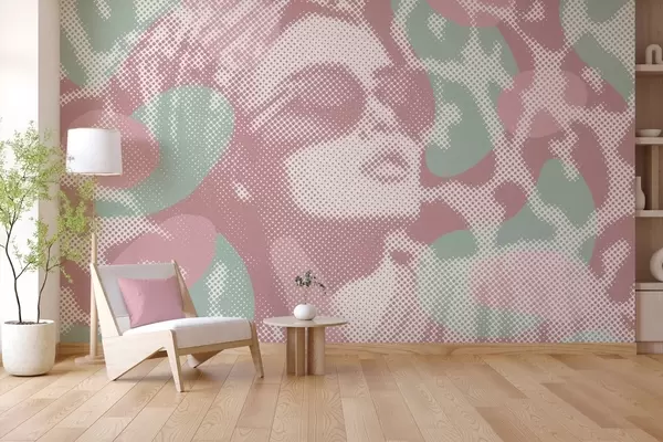 Carta da parati ritratto di una donna su sfondo leopardato in stile puntinato nei toni del rosa e del verde nr. w04630v2