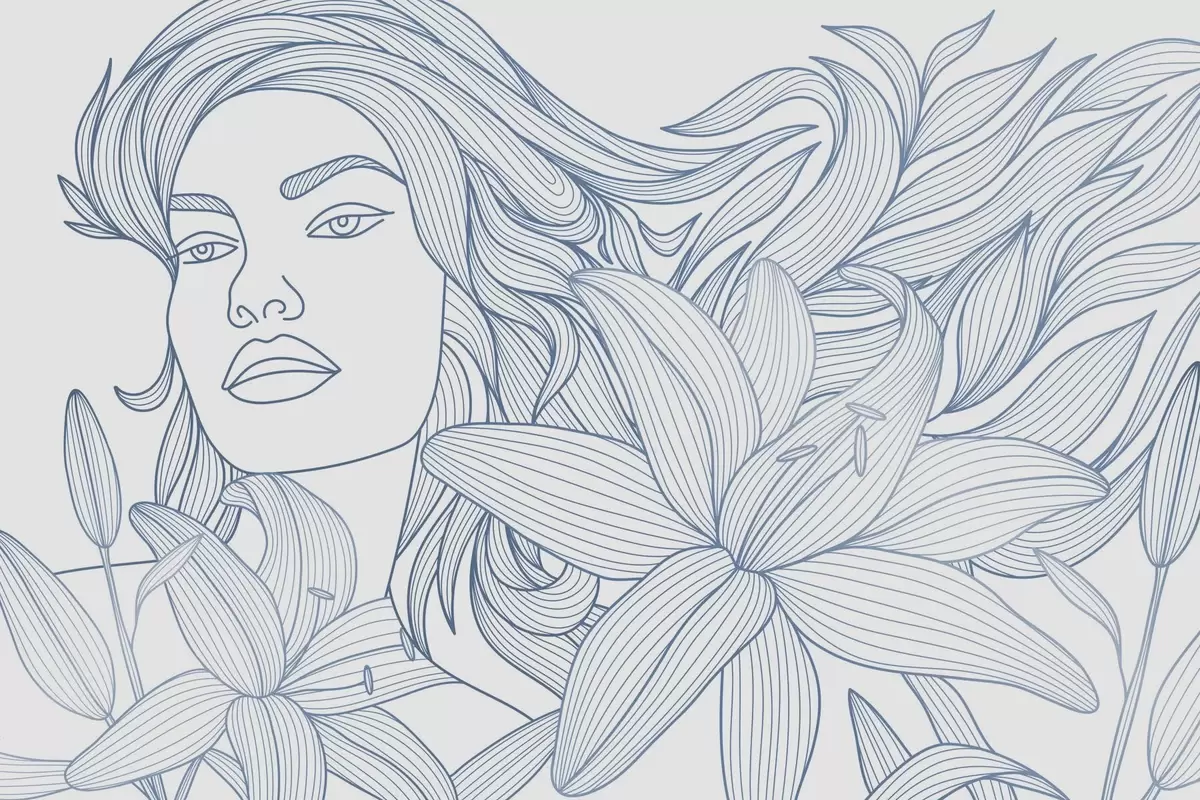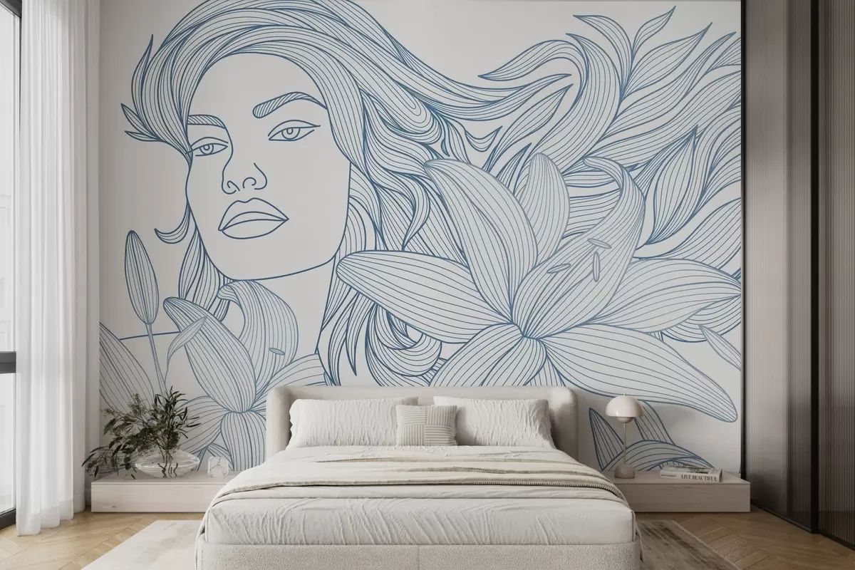 Carta da parati Ritratto di una ragazza tra fiori di giglio nei toni del blu nr. w04689v2