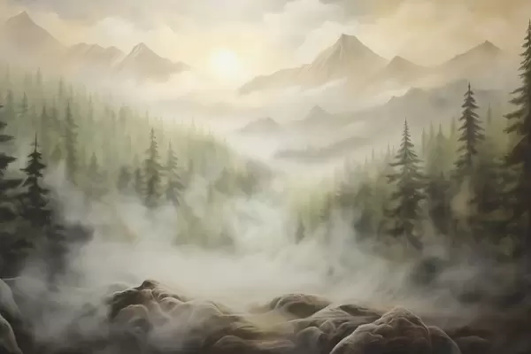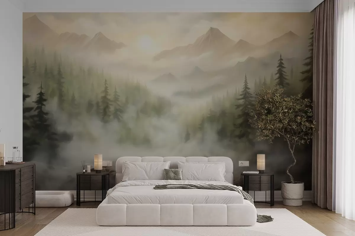 Carta da parati Foresta nella nebbia sullo sfondo delle montagne nr. w04730