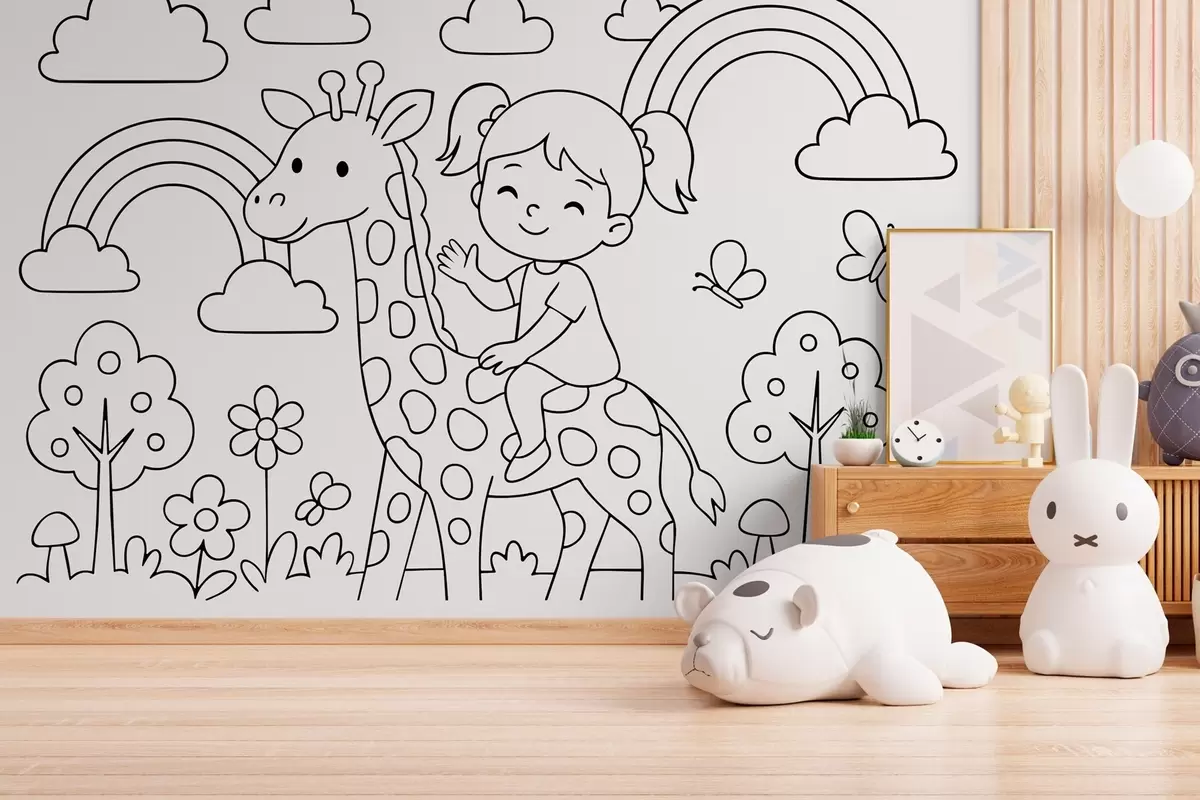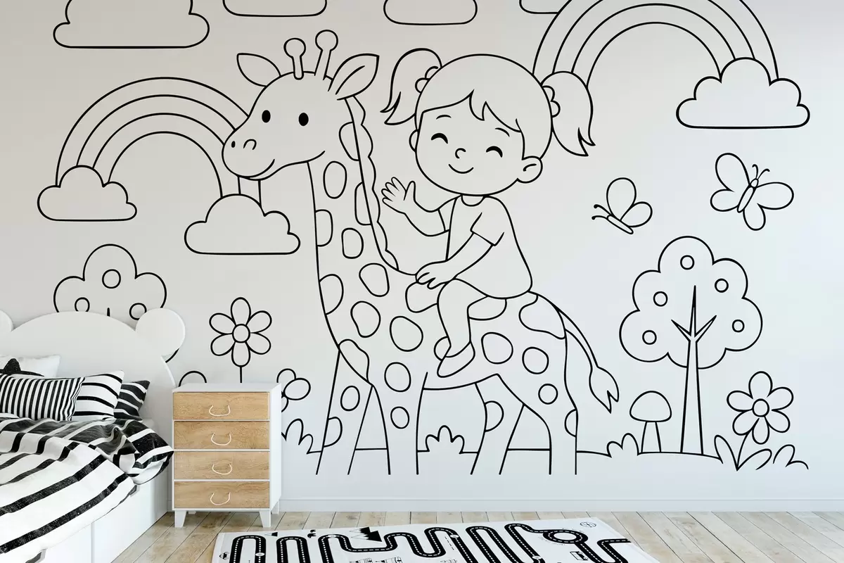 Carta da parati disegno in bianco e nero di una ragazza su una giraffa nello stile di un libro da colorare per bambini nr. w04753