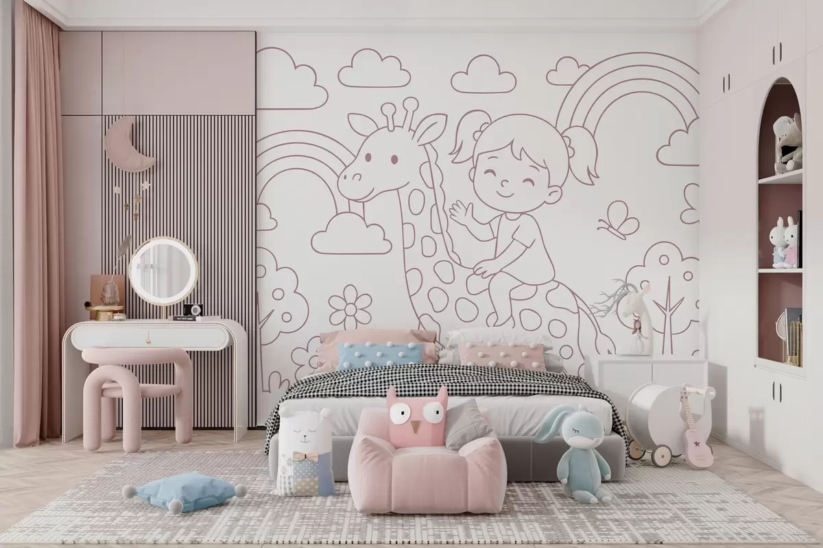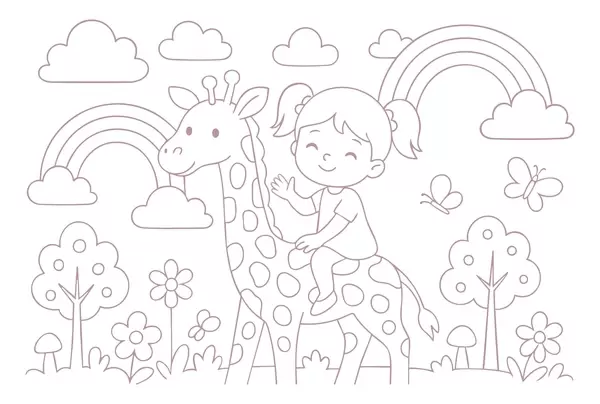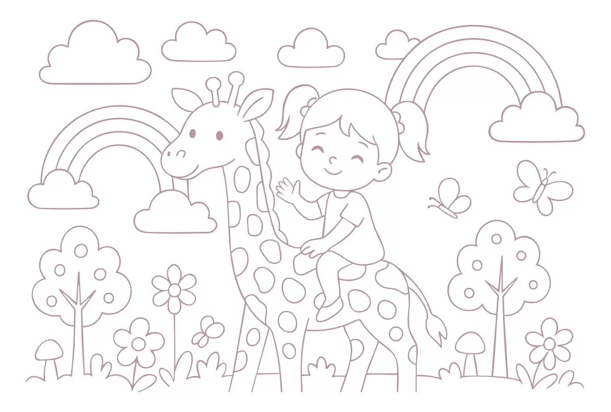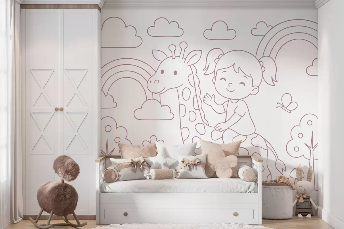 Carta da parati dipinto a polvere raffigurante una ragazza su una giraffa nello stile di un libro da colorare per bambini nr. w04753v1