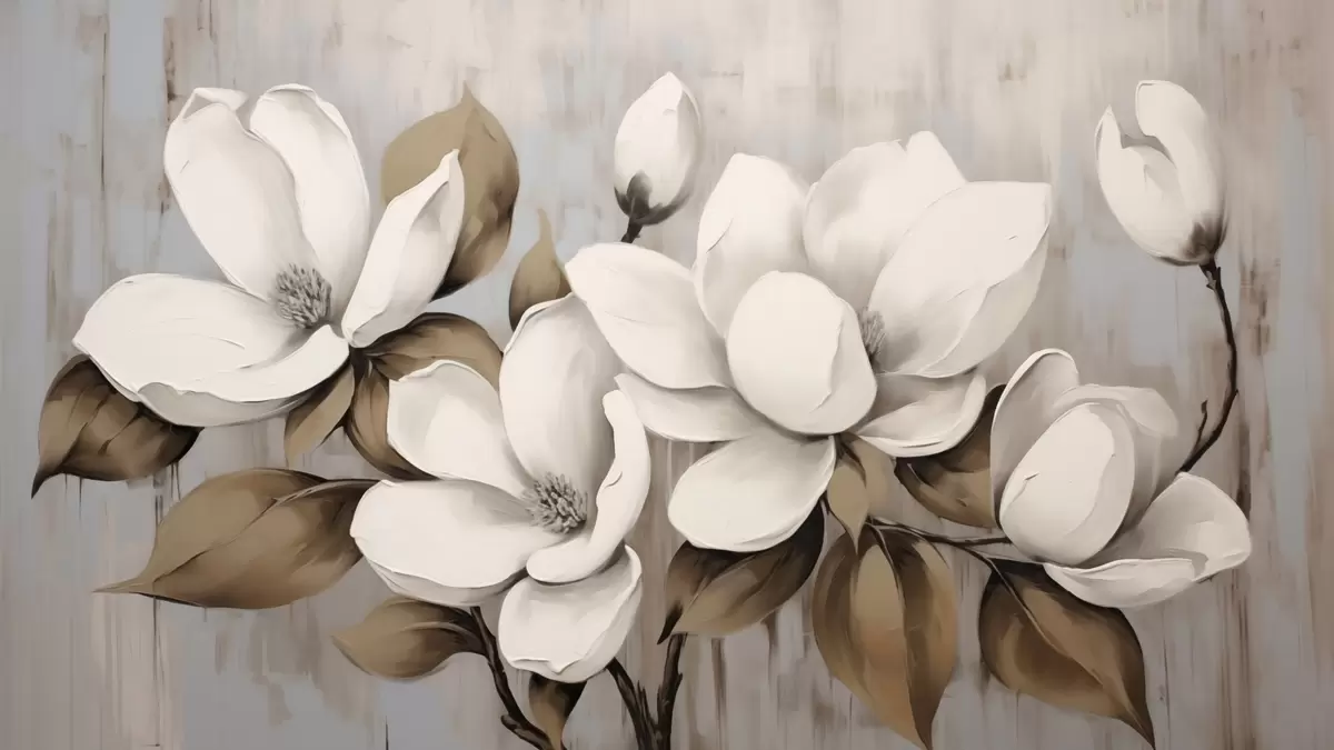 Carta da parati Grandi fiori di magnolia con foglie color tortora su sfondo spazzolato nr. w04785