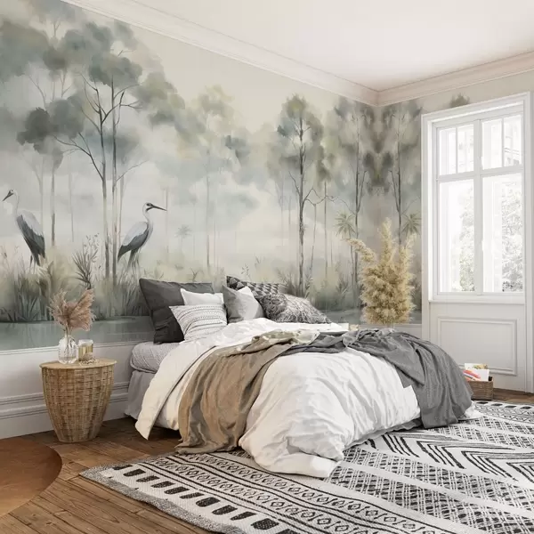 Carta da parati Foresta nebbiosa in riva al lago con aironi, palette dai colori tenui e freddi nr. w04788
