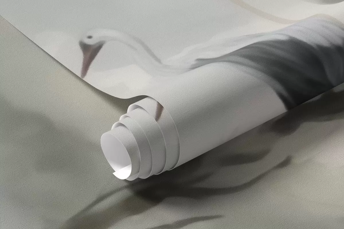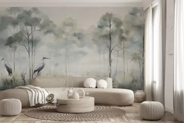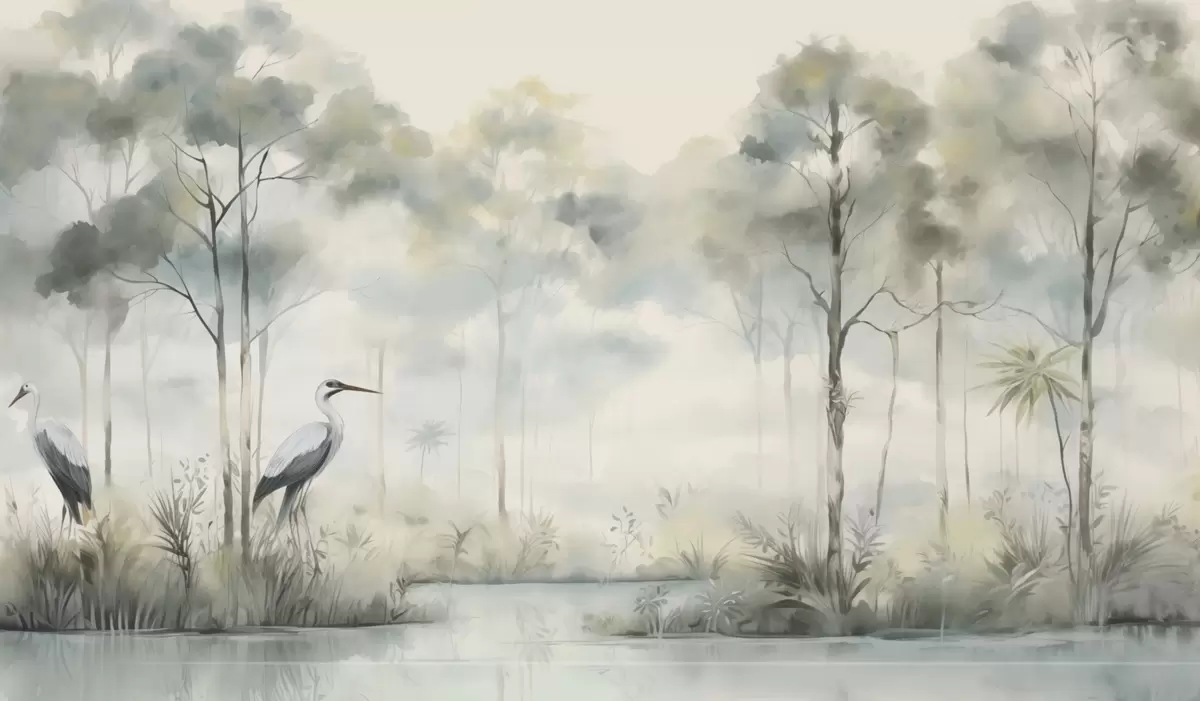 Carta da parati Foresta nebbiosa in riva al lago con aironi, palette dai colori tenui e freddi nr. w04788