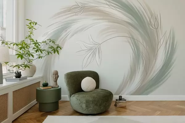 Carta da parati piume e fiori verdi e beige, dipinti a mano nr. w04816