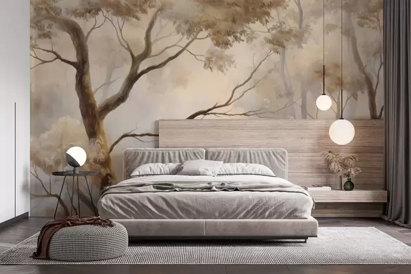 Carta da parati La foresta nella leggera nebbia mattutina. Un delicato dipinto atmosferico nello stile di un paesaggio artistico. nr. w04817