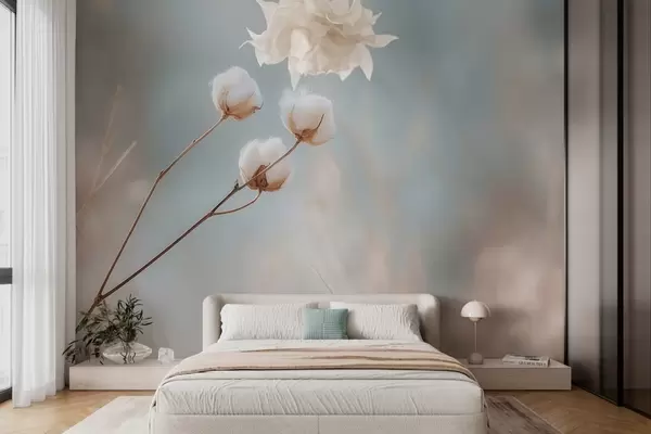 Carta da parati tre fiori di cotone su uno sfondo sfocato nr. w04820
