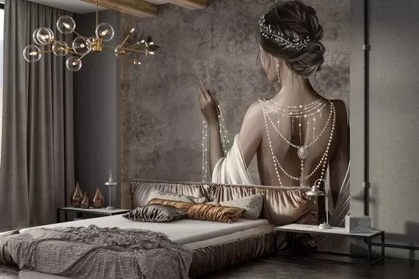 Carta da parati Donna vista da dietro con perle, sfondo con motivo a pietre grigie nr. w04854
