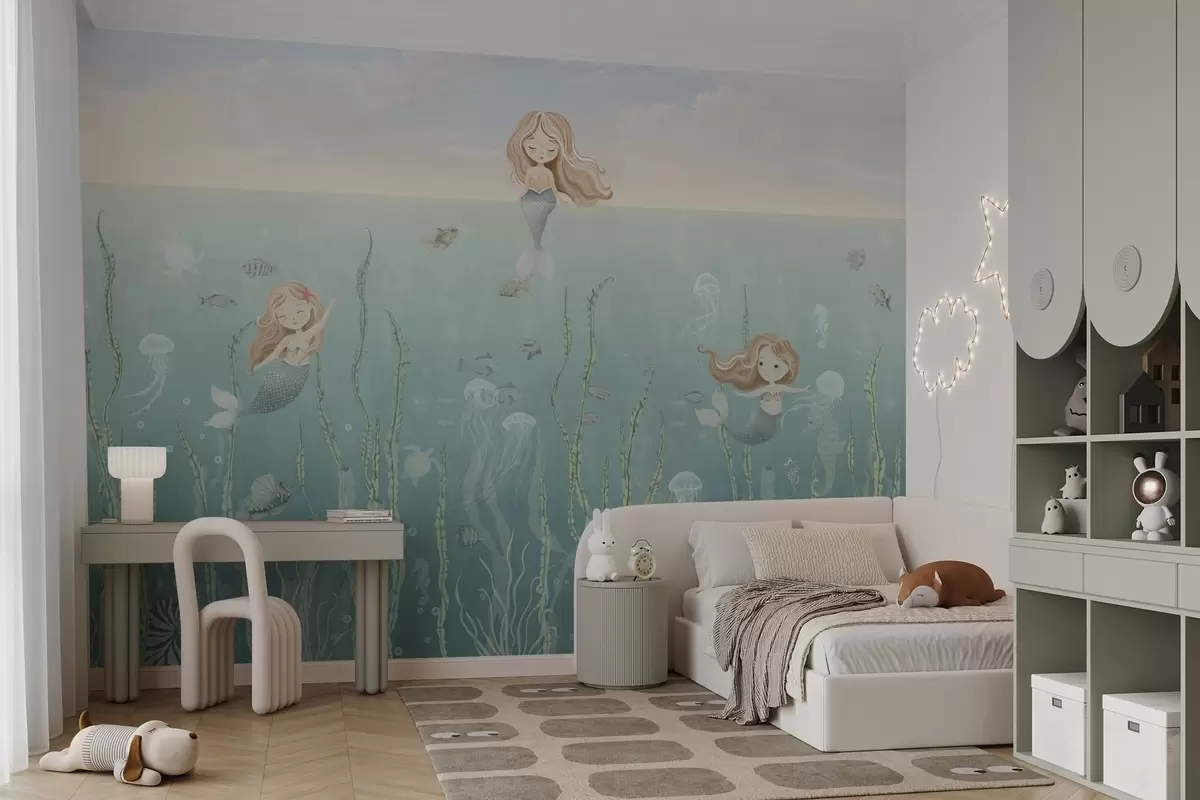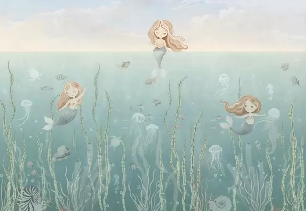 Carta da parati Sirene giocose sott'acqua con alghe, meduse e pesci nr. w04860