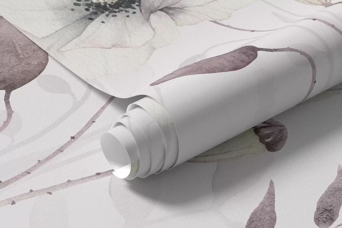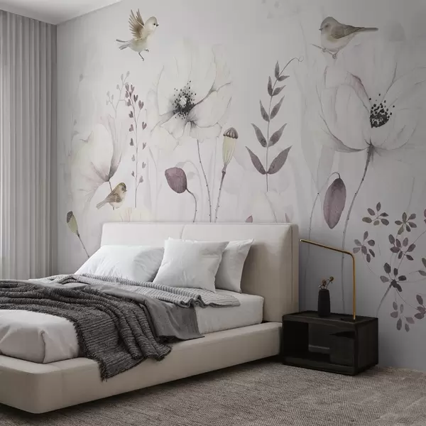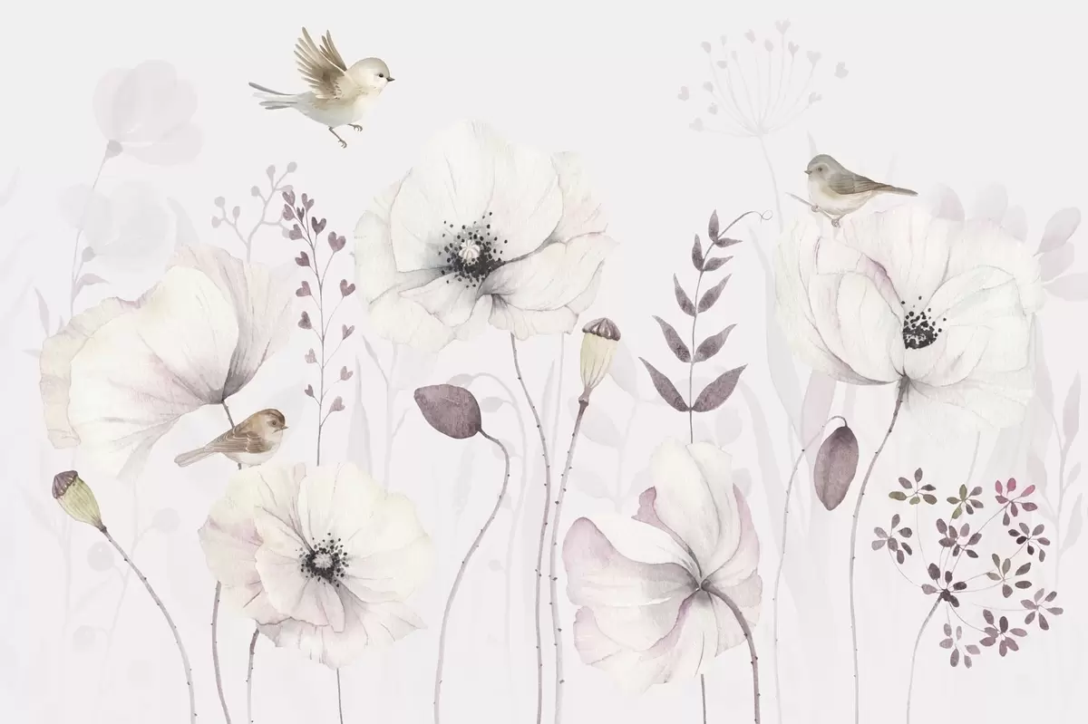 Carta da parati Papaveri acquerellati con piccoli uccellini in morbido color malva nr. w04861
