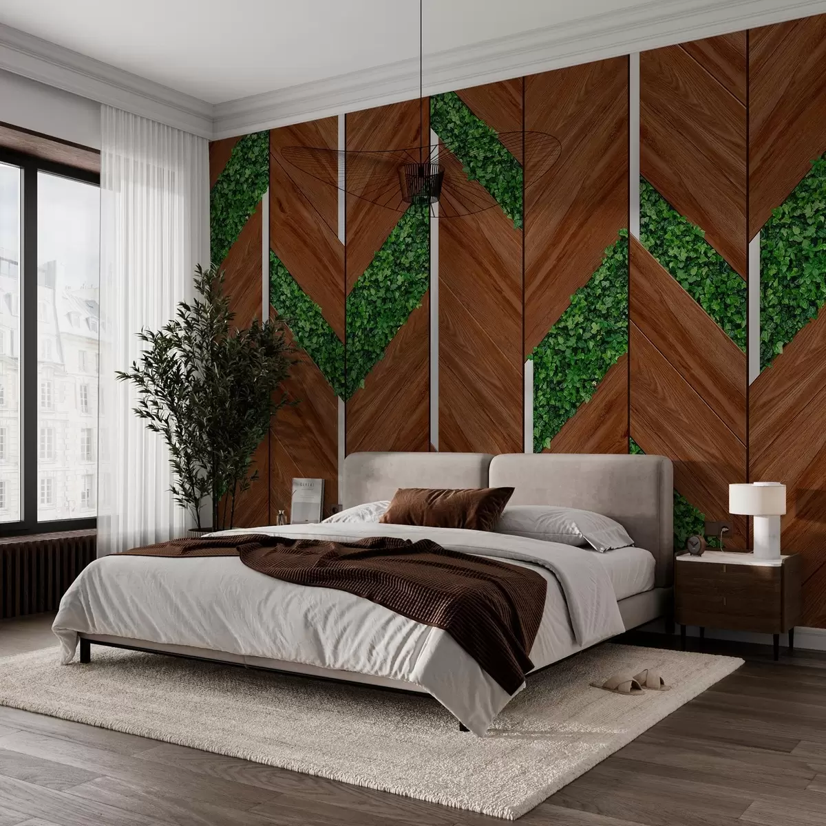 Carta da parati imitazione di pannelli in legno scuro con inserti vegetali nr. w04875v1