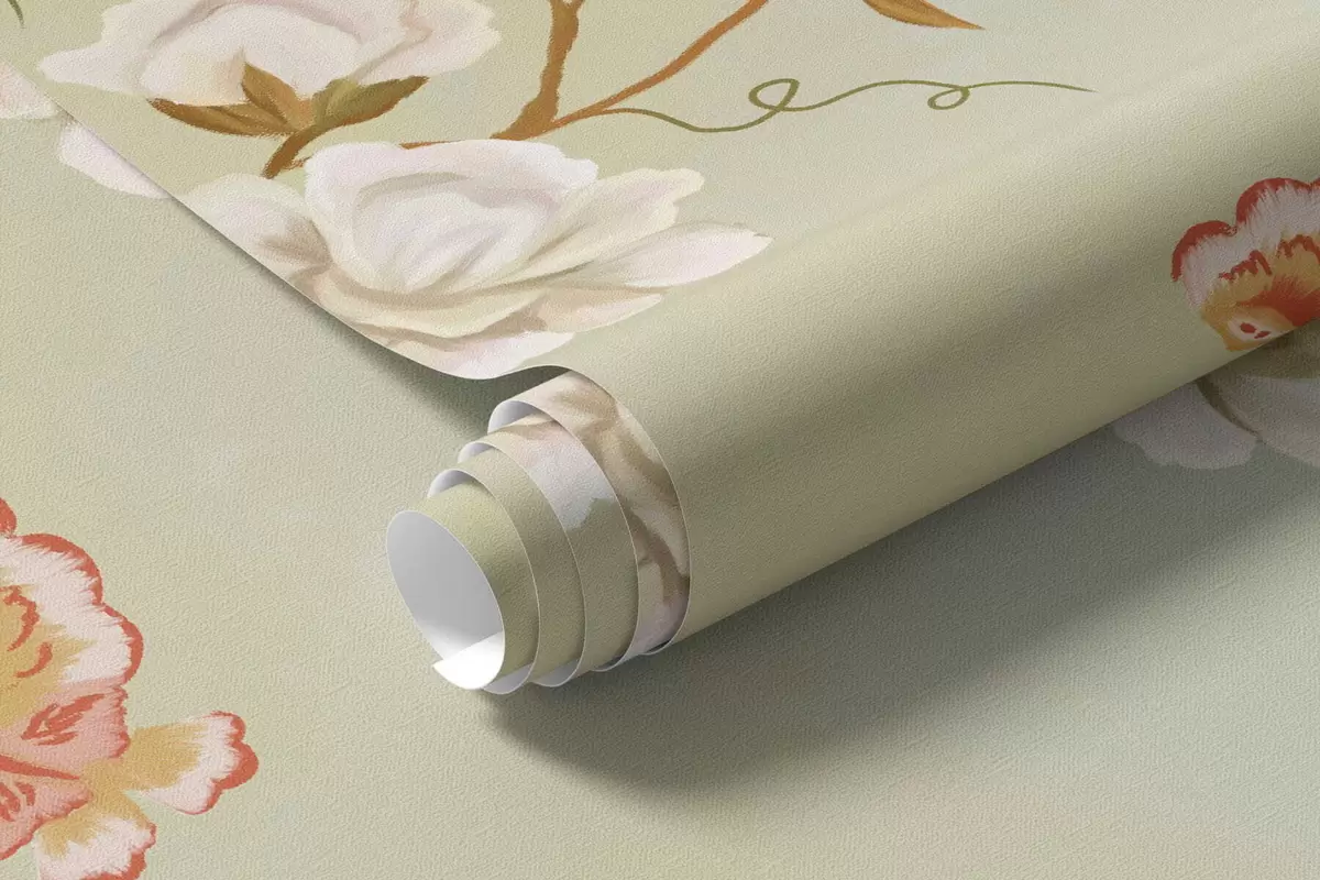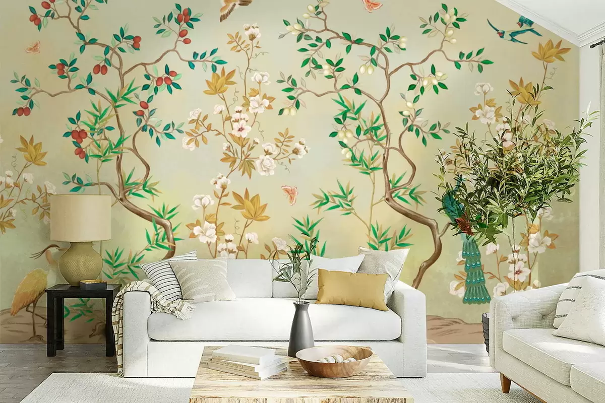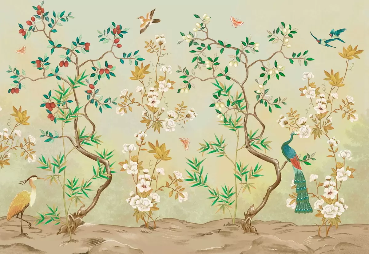 Carta da parati Scena con alberi, fiori e uccelli, sfondo chiaro nr. w05004v1