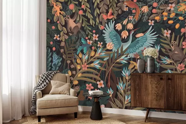 Carta da parati Scena fantastica con uccelli e animali tra le piante nr. w05024