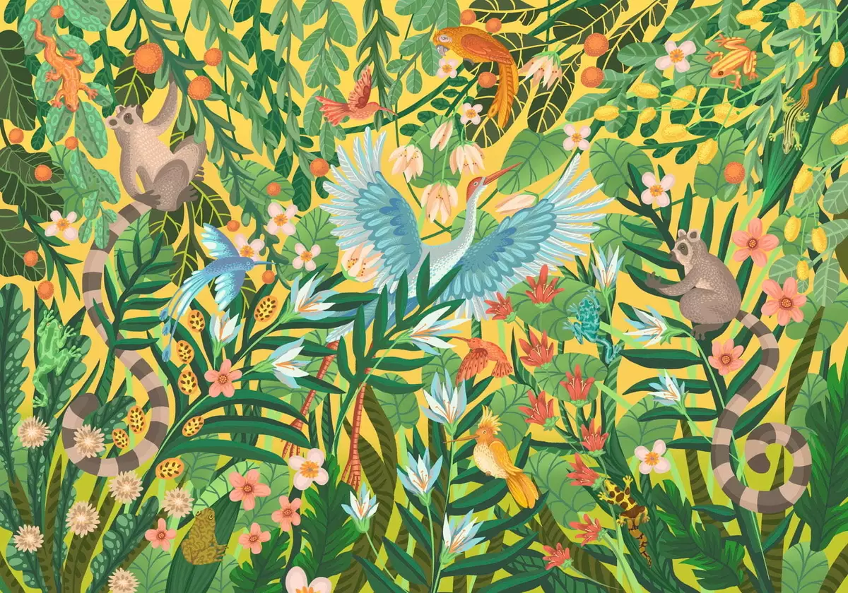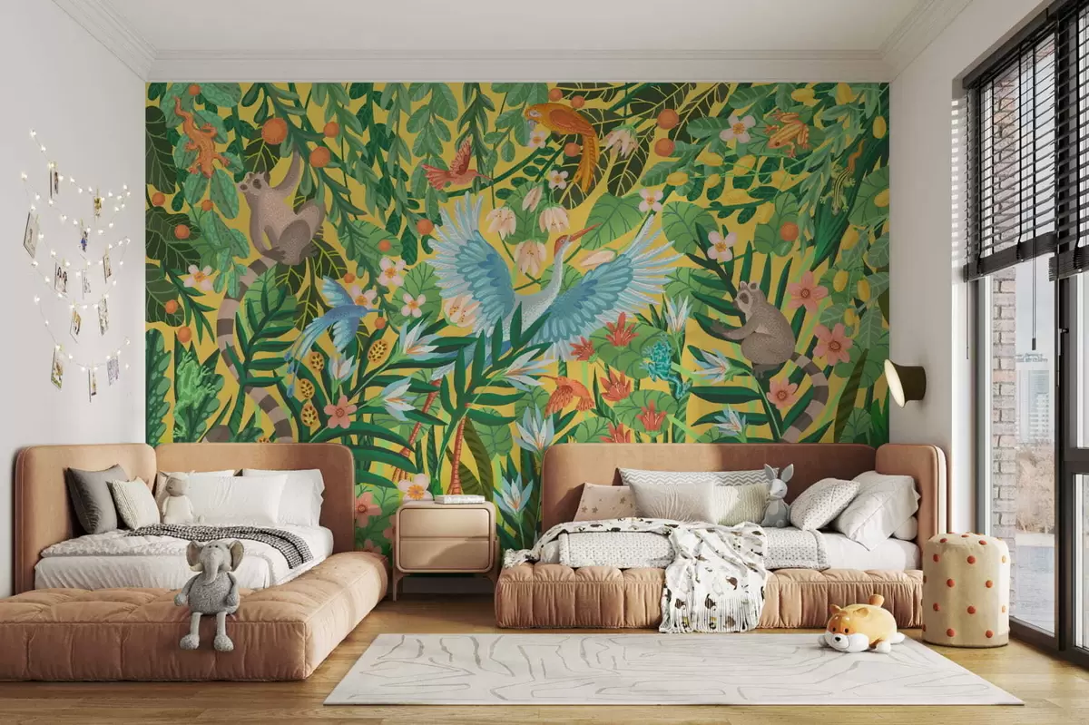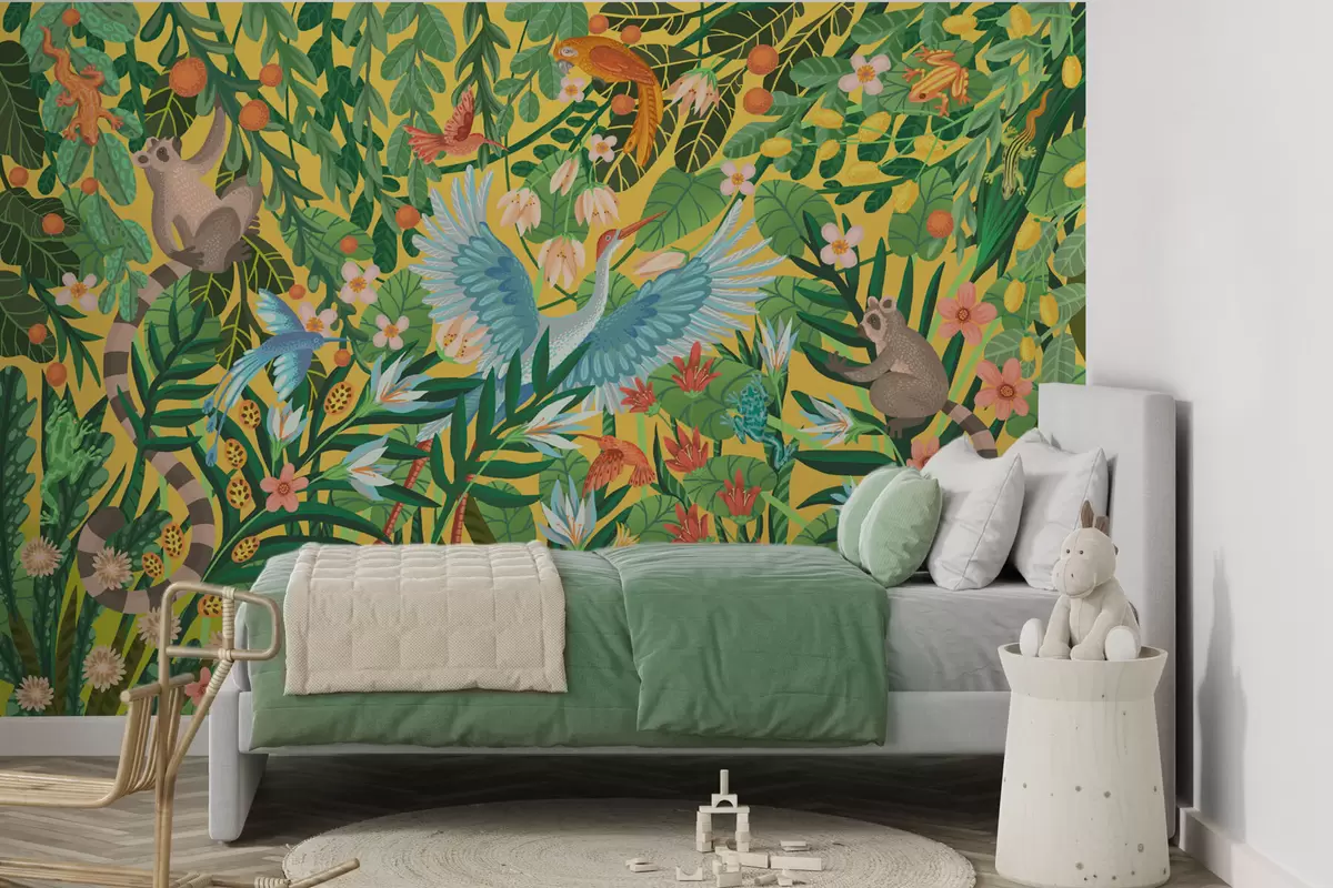 Carta da parati Scena luminosa con uccelli e animali in una fitta vegetazione nr. w05024v1