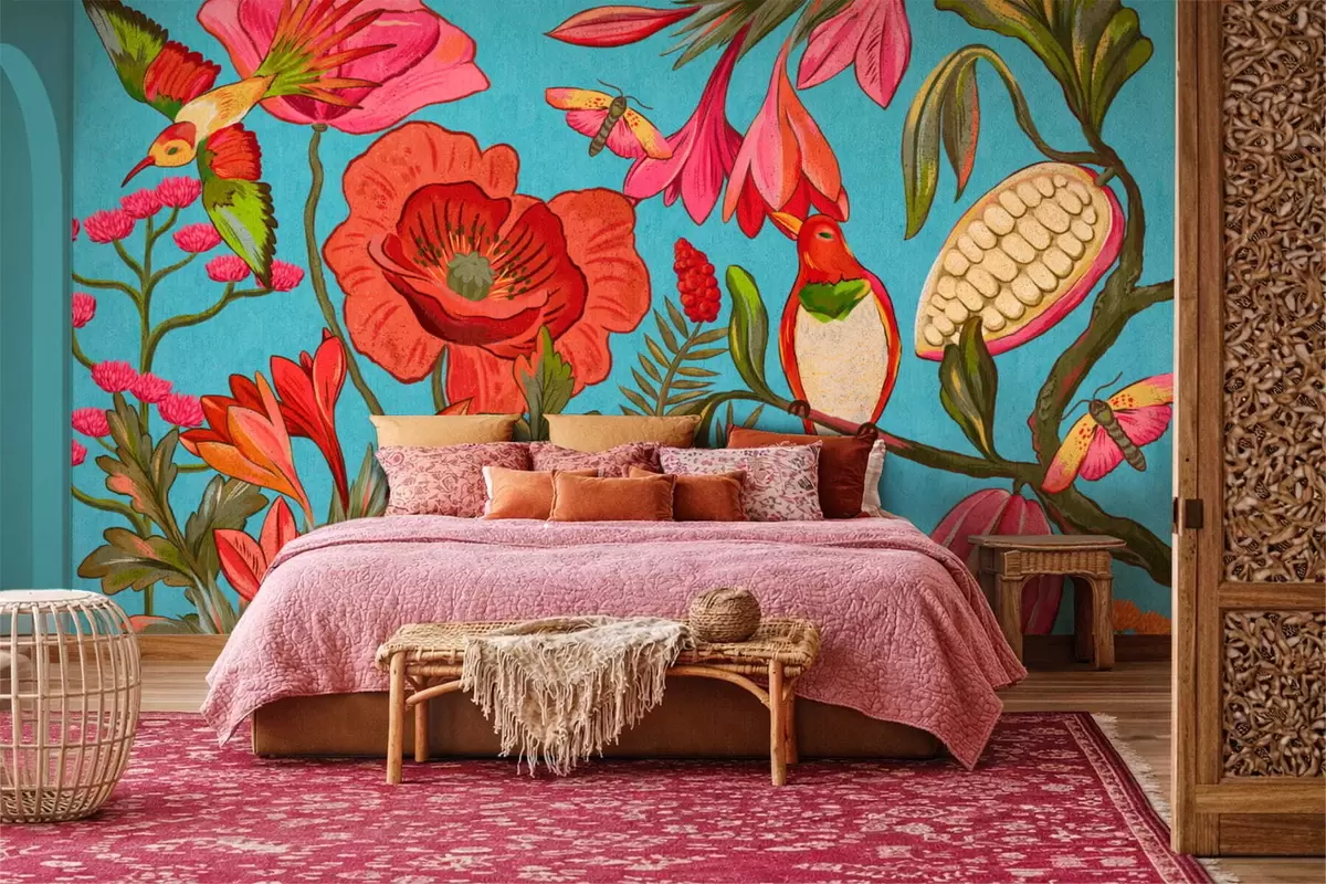 Carta da parati Fiori e uccelli decorativi su sfondo blu nr. w05036v3