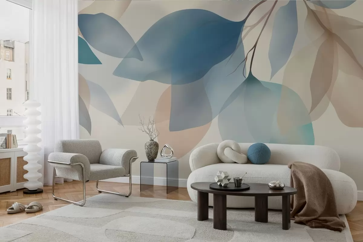 Carta da parati eleganti foglie semitrasparenti nei toni del blu e del beige nr. w05060