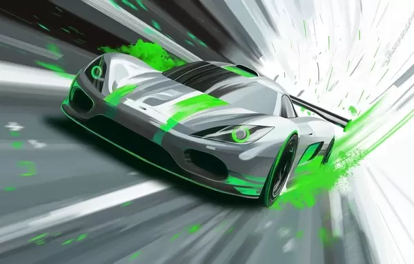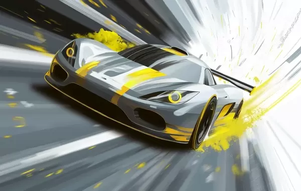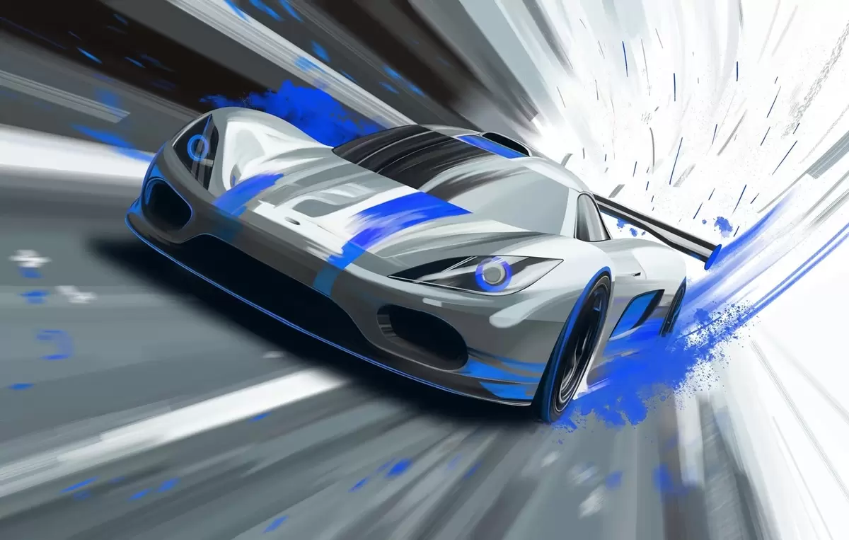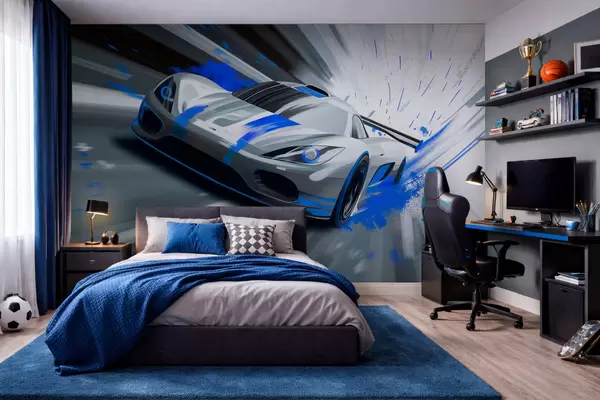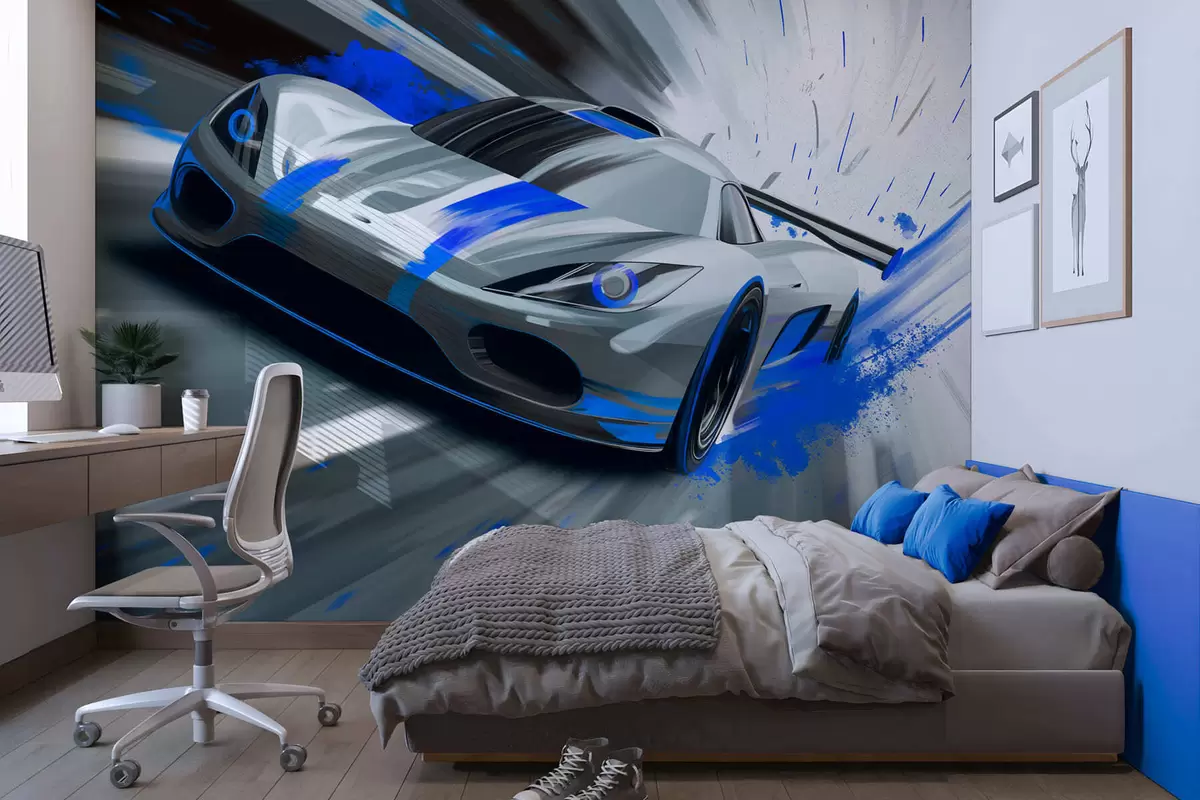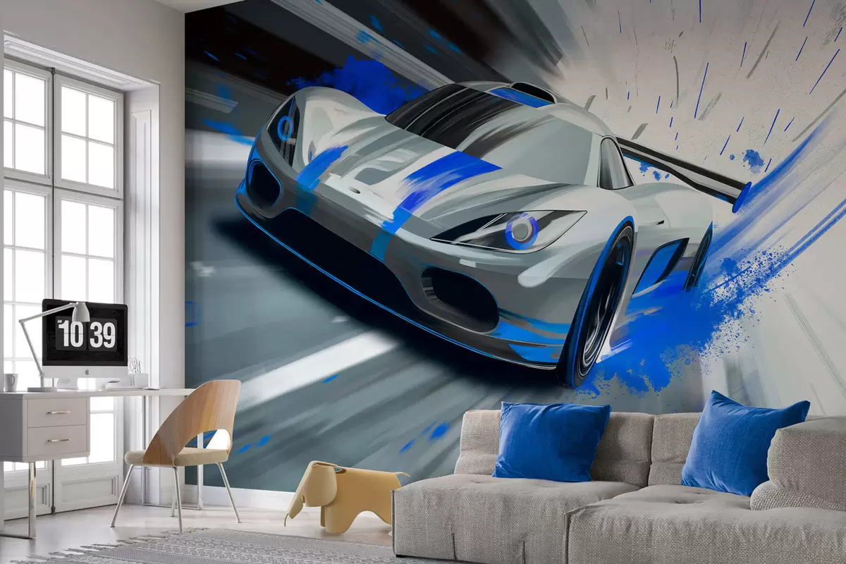 Carta da parati auto sportiva dinamica in stile disegno digitale con accenti blu nr. w05069
