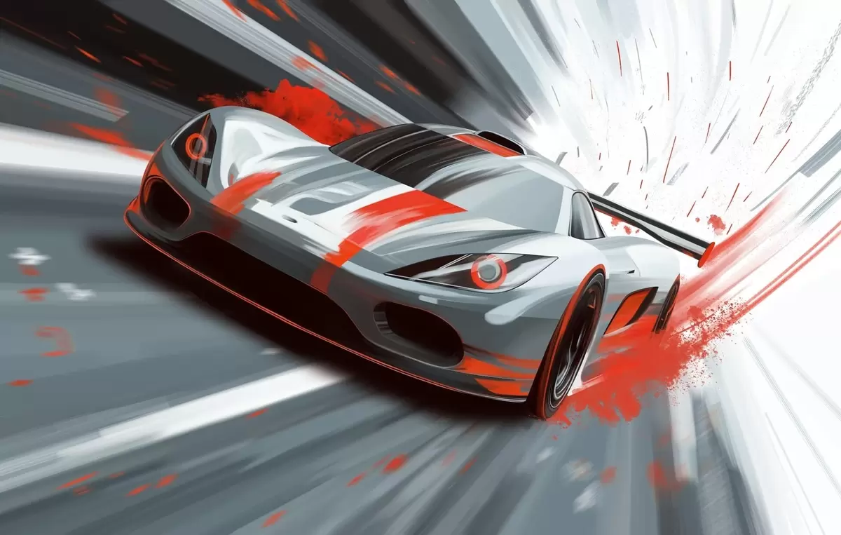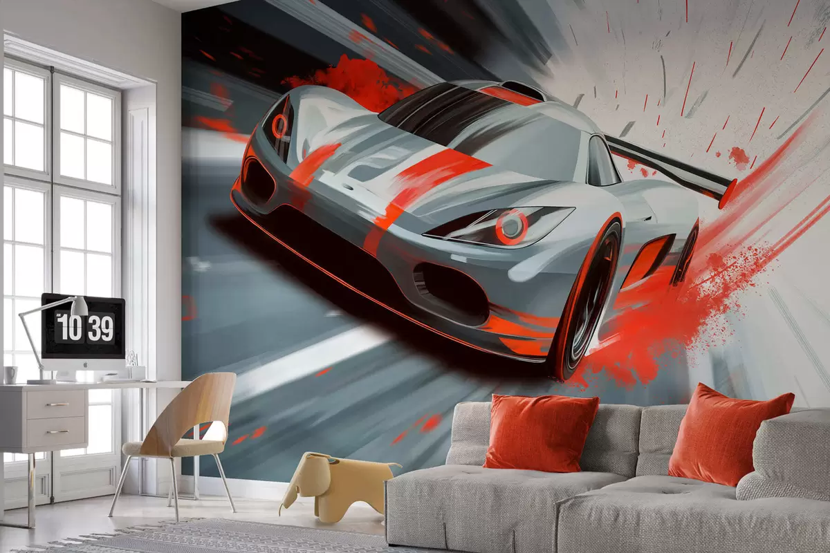 Carta da parati auto sportiva dinamica in stile disegno digitale con accenti rossi nr. w05069v1