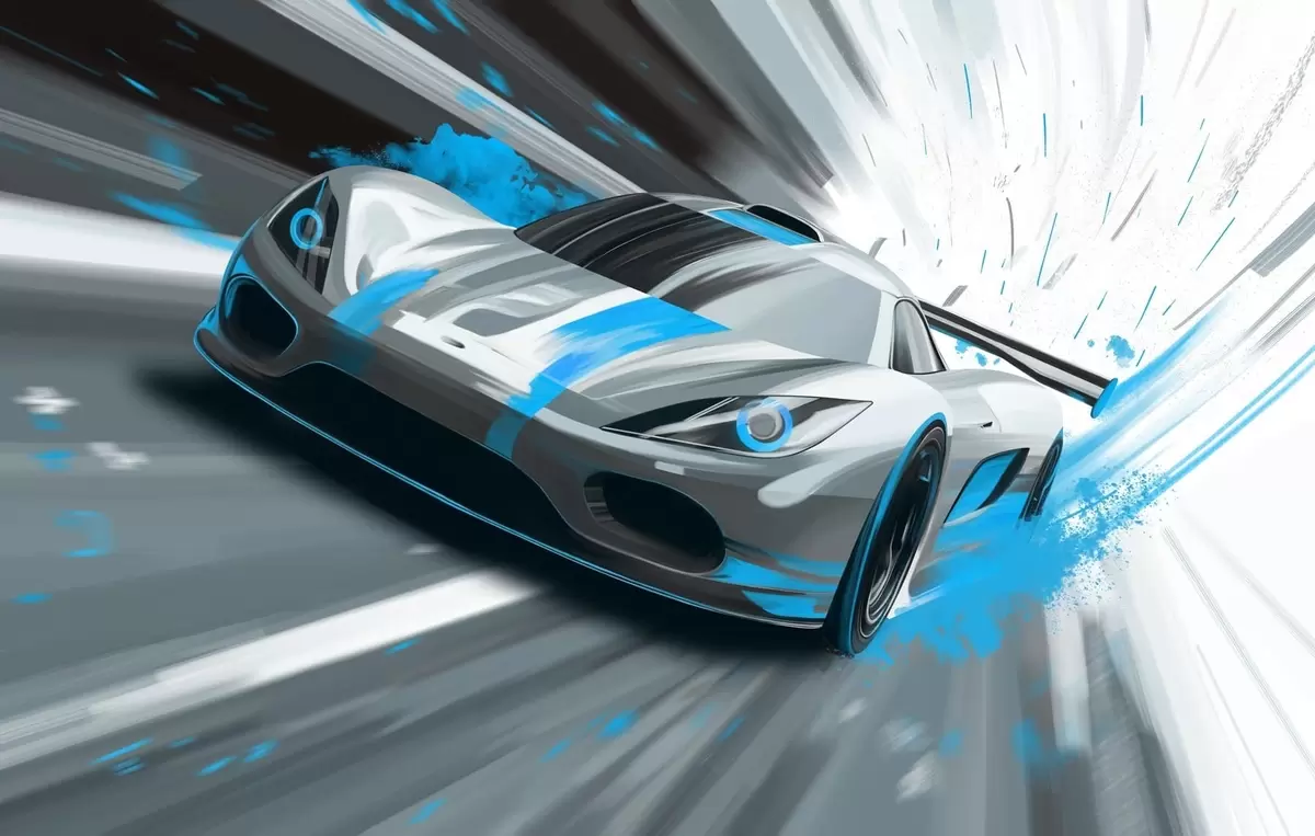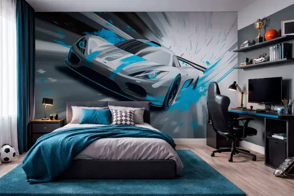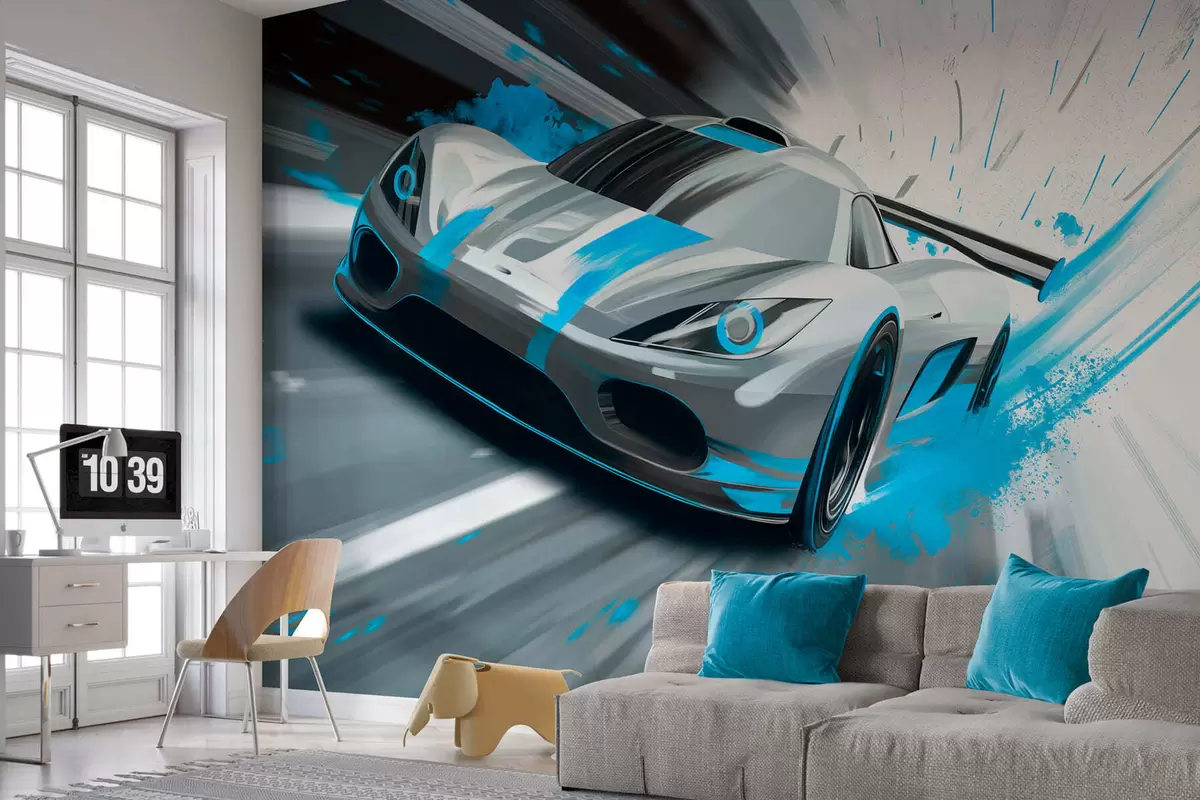 Carta da parati auto sportiva dinamica in stile disegno digitale con accenti turchesi nr. w05069v3