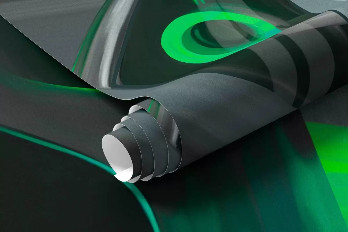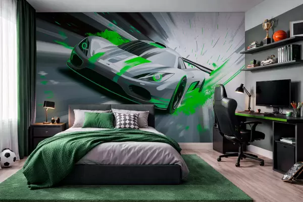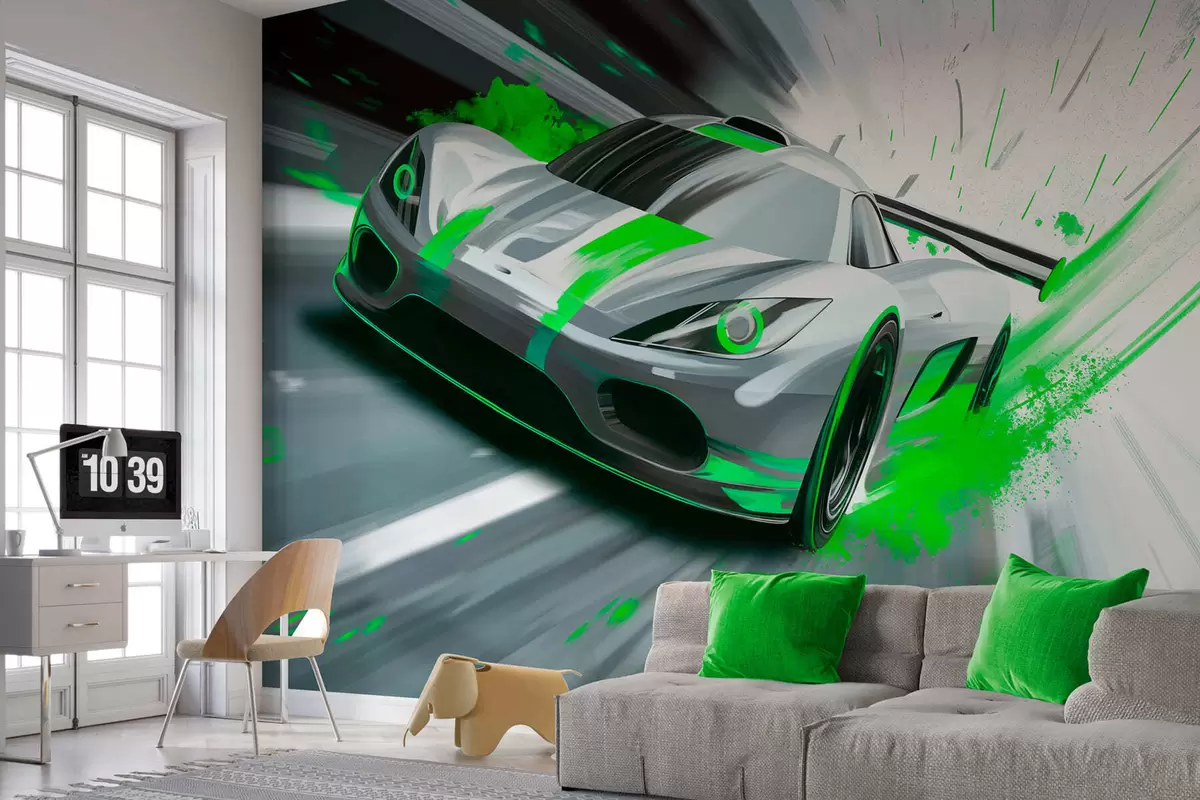 Carta da parati auto sportiva dinamica in stile disegno digitale con accenti verdi nr. w05069v4