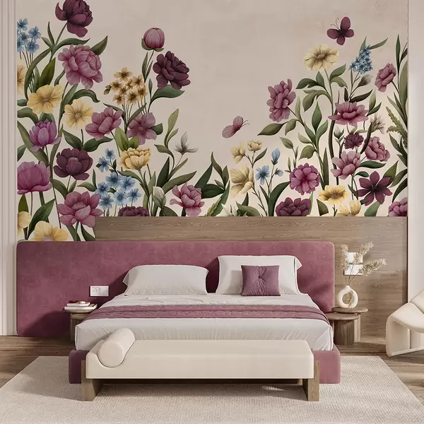 Carta da parati Composizione floreale con piante e farfalle su sfondo chiaro nr. w05072