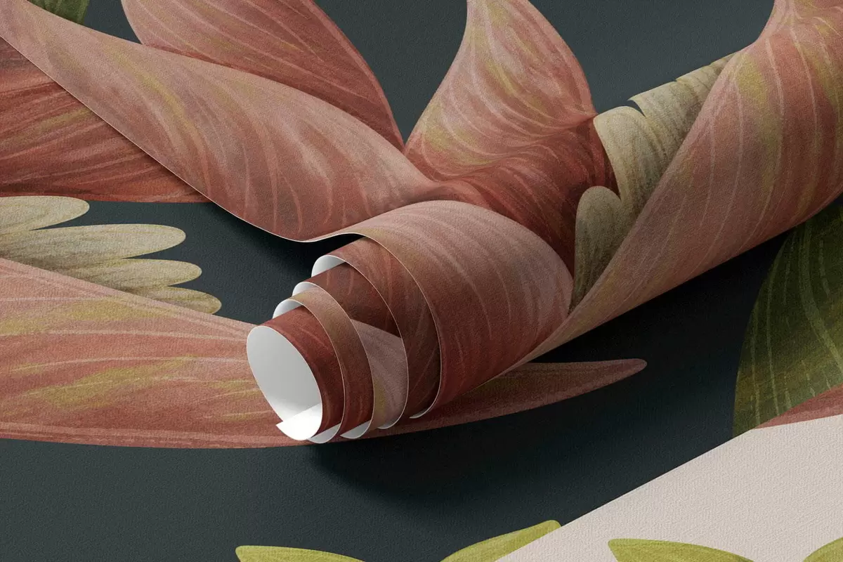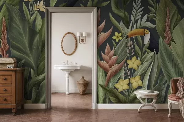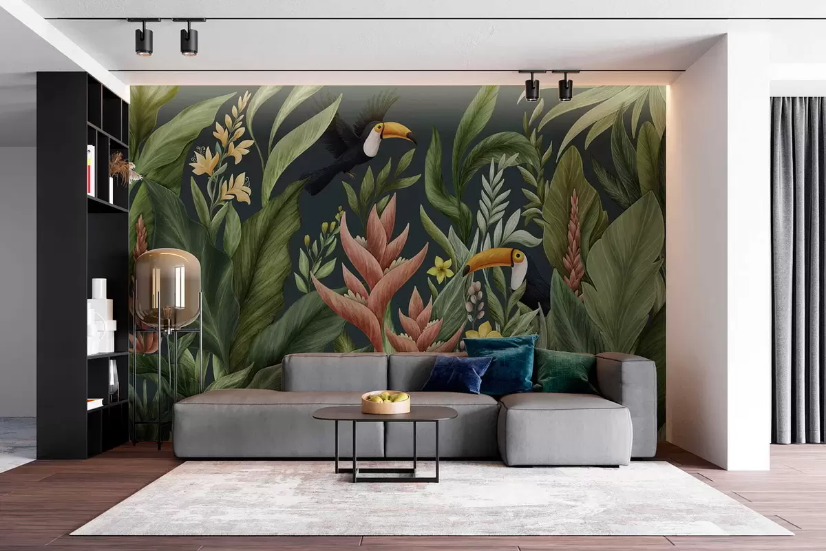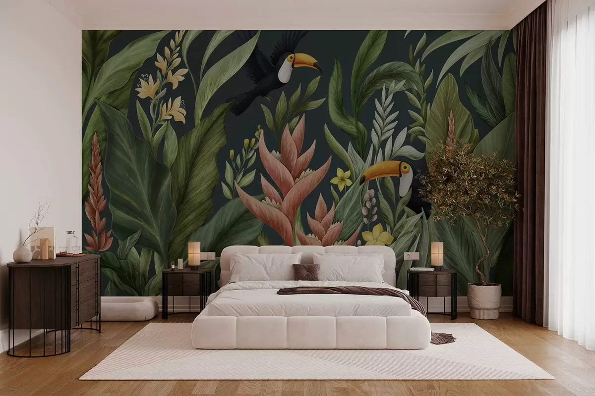Carta da parati Piante tropicali e uccelli dal becco grande su sfondo scuro nr. w05088v2