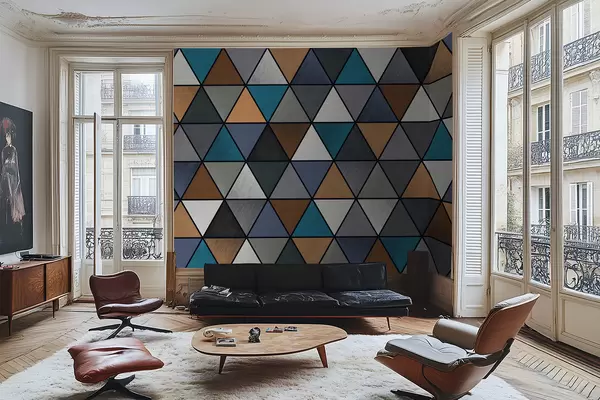 Carta da parati Motivo geometrico triangolare nei toni del blu e dei colori caldi nr. w05095